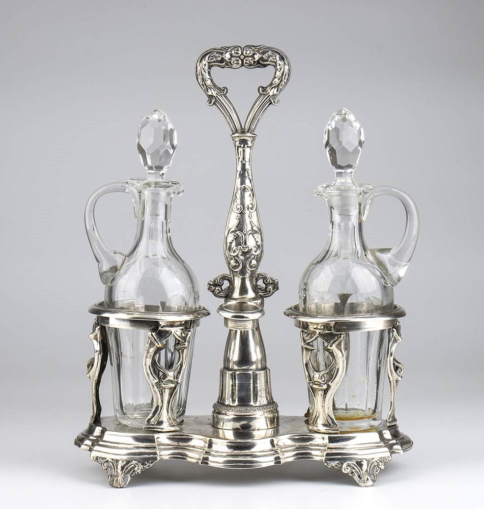 di forma sagomata, poggiante su quattro piedini fogliati; presa centrale con due ampolle laterali in vetro. Argento 800/1000, punzonata con i marchi in uso a Novara, Regno di Sardegna dal 1824 al 1872 e con il marchio dell'argentiere Canetti Federico operante a Vercelli a partire dal 1824.