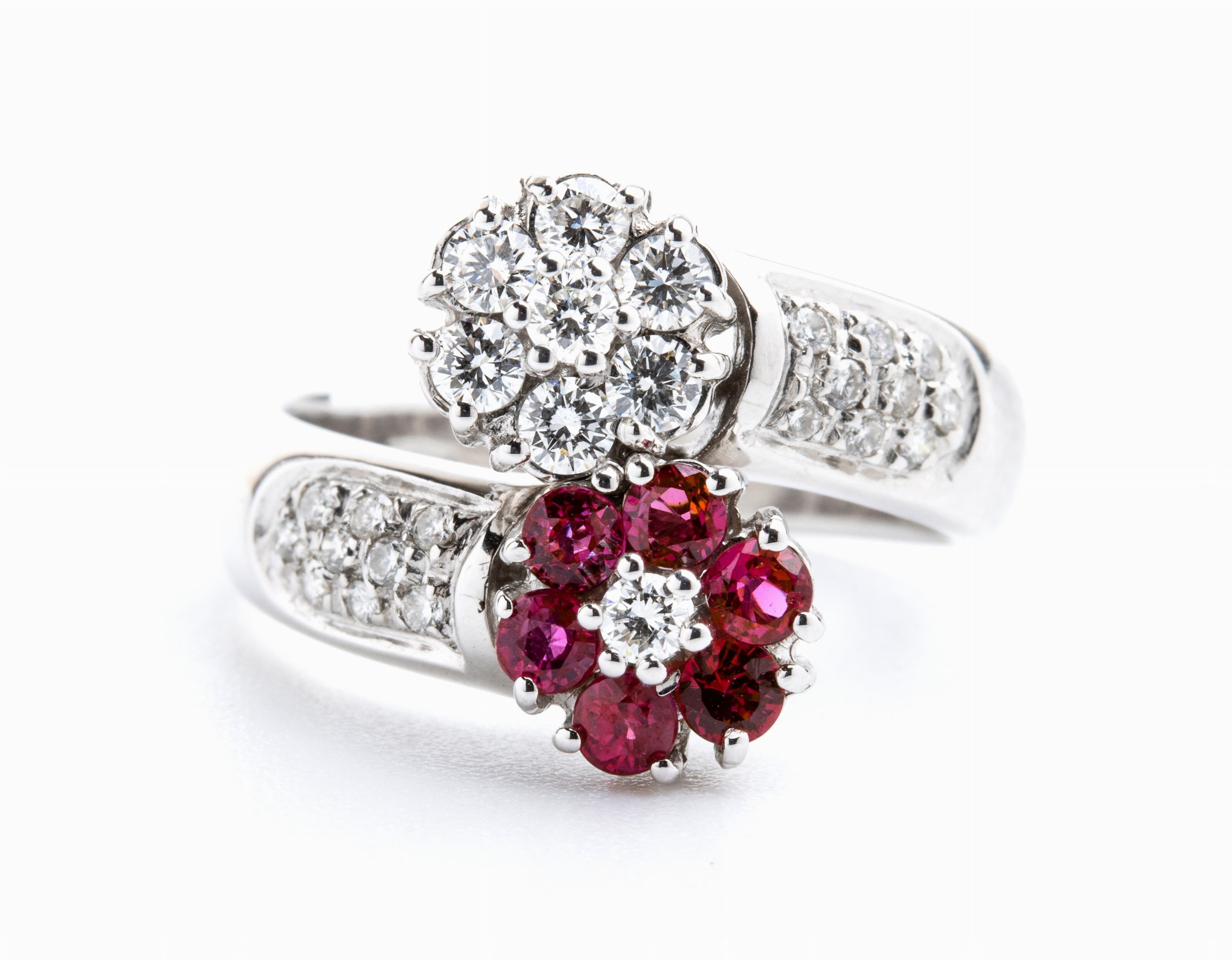 oro bianco 18k, motivo contrarie' con motivi a fiore in rubini e diamanti.