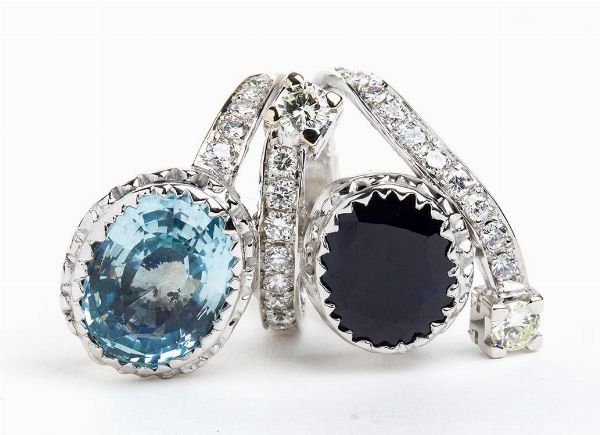 in oro bianco 18k, incastonato con zaffiro ed acquamarina affiancati da diamanti. N. 01 corindone varietà zaffiro, forma ovale, taglio composito, carati xxx ca. Diamanti rotondi taglio brillante 2,30 ct circa, E-F, IF-VVS.