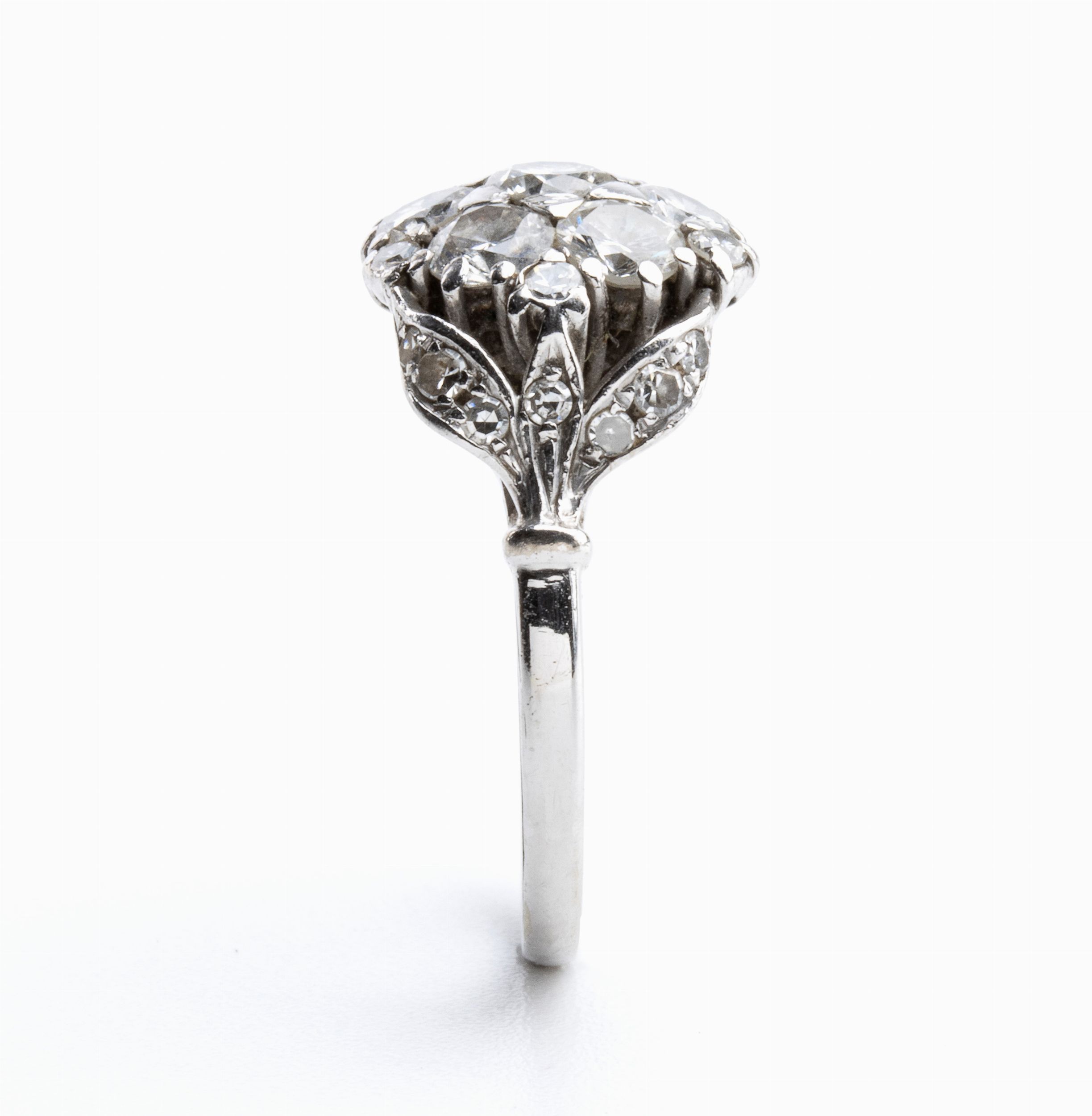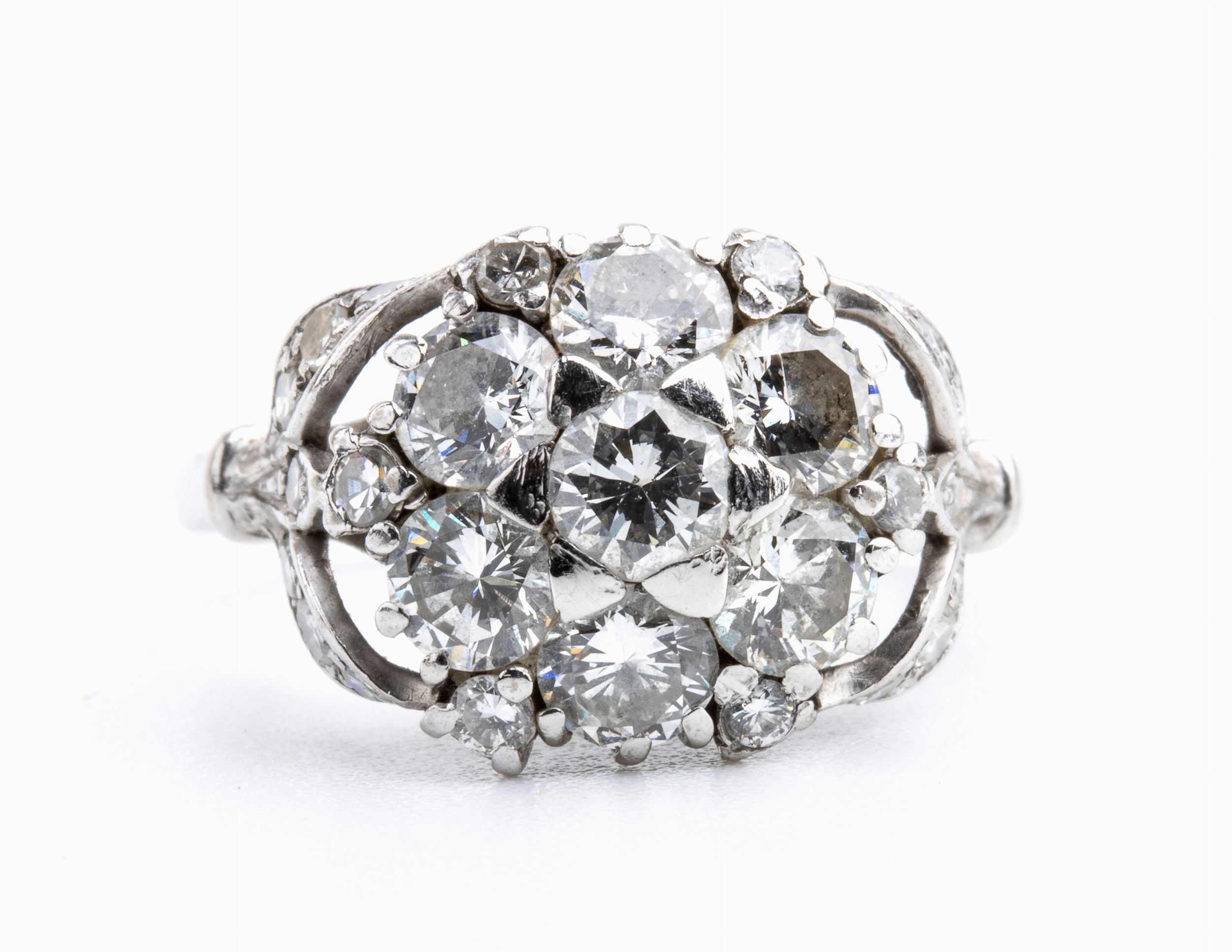 motivo floreale impreziosito da diamanti.N. 27 diamanti di forma rotonda, taglio brillante e taglio huit-huit, circa 1.70 ct, G-H, VVS-VS.Misura IT 11 - Misura USA 5 1/2. Peso 4,9 gr.Stato di conservazione: **** buono.