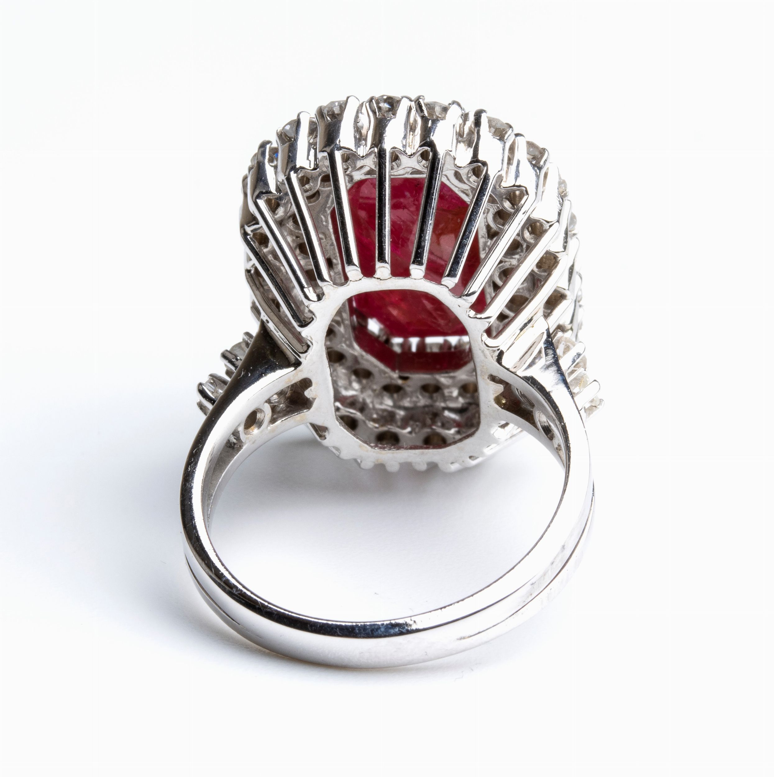 in oro bianco 18k, con rubino centrale tra doppia cornice di diamanti.
