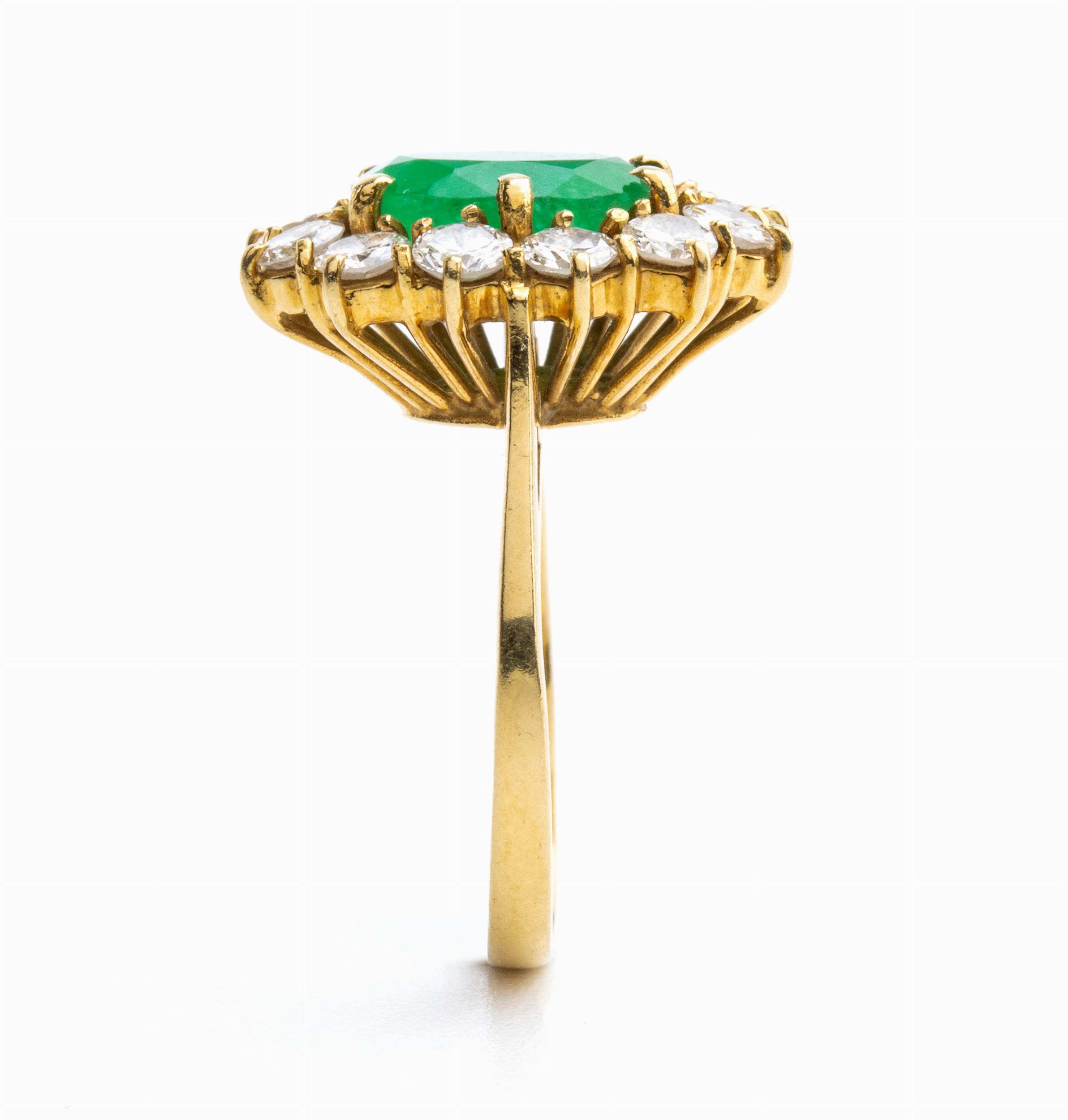 montatura a fiore in oro giallo 18k con smeraldo incorniciato da diamanti.