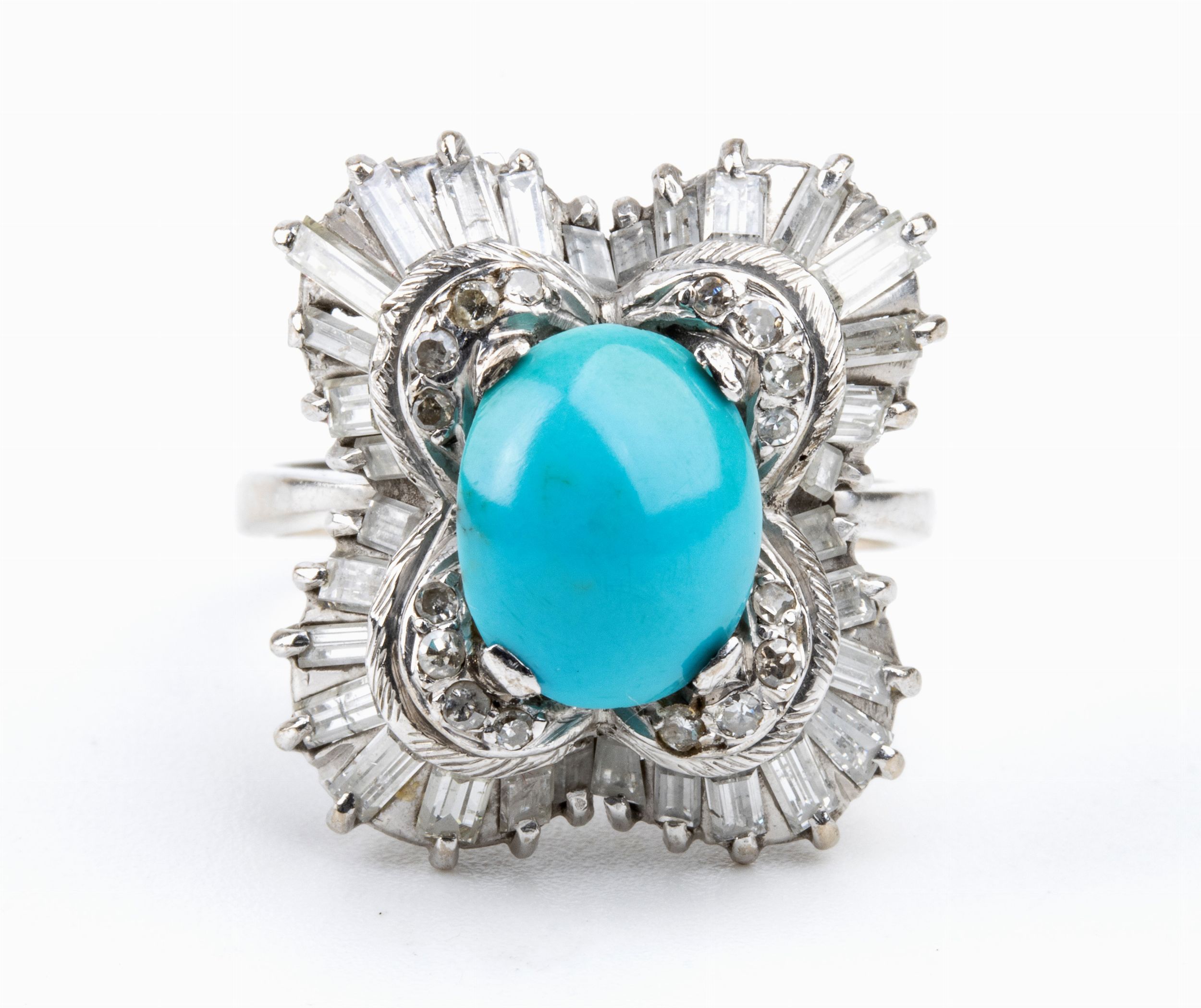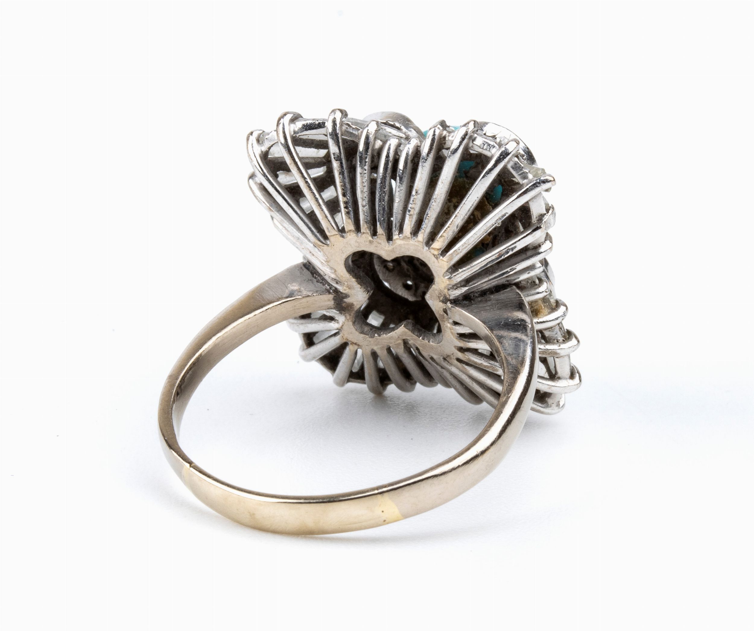 montatura a ballerina con al centro un cabochon di turchese contornata da diamanti.