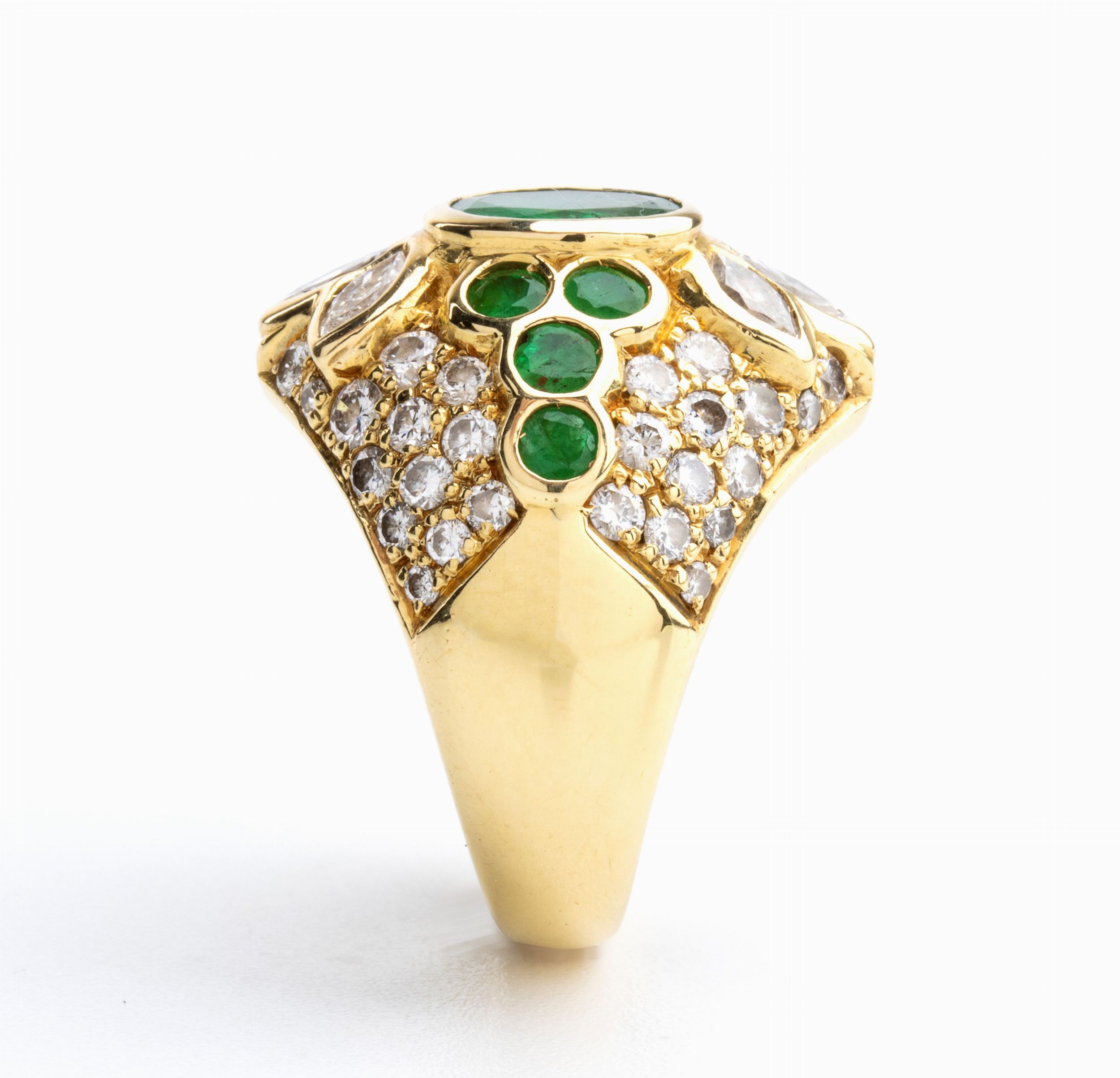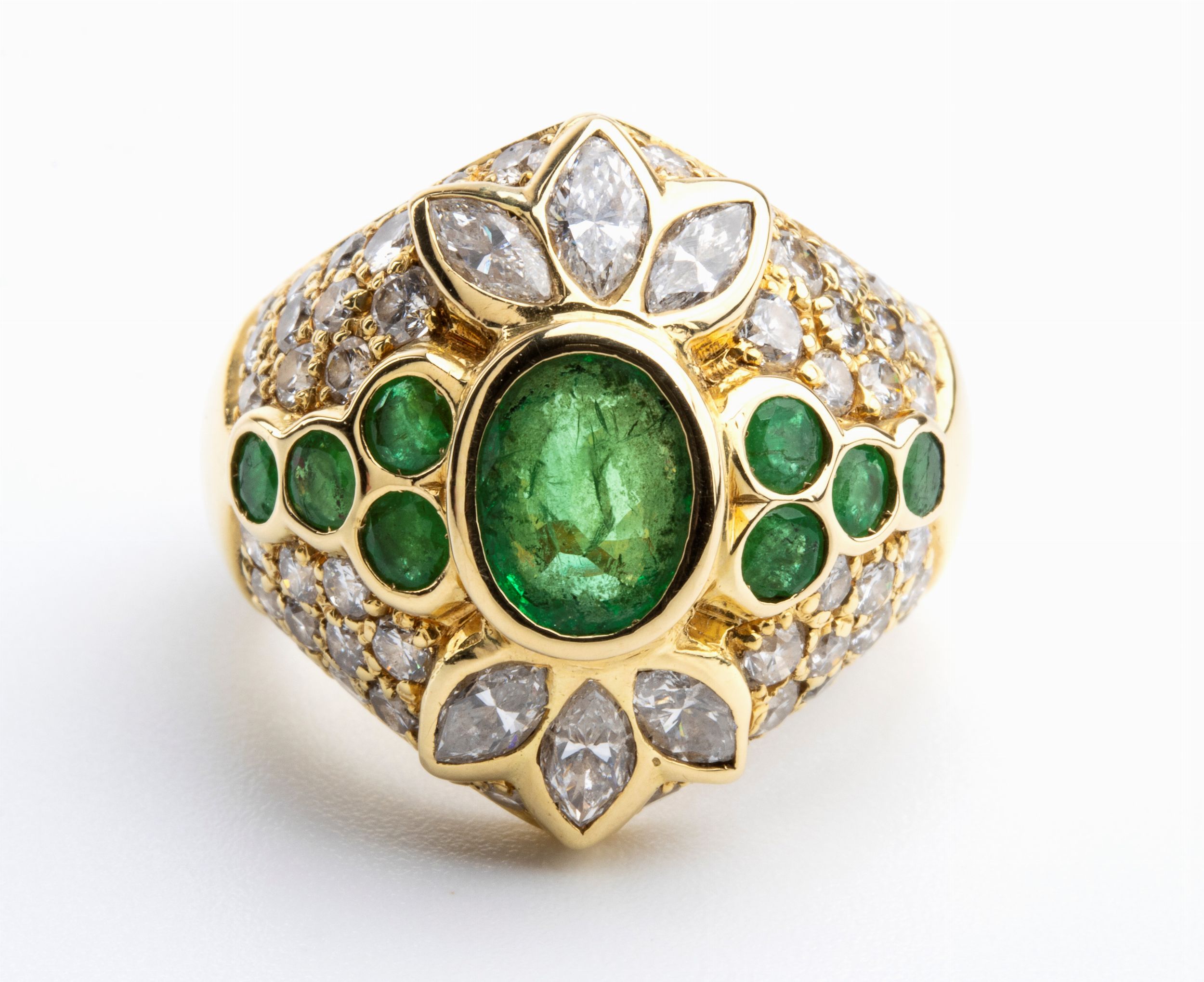 in oro giallo 18k, a fascia, a motivo floreale impreziosito da smeraldi e diamanti.