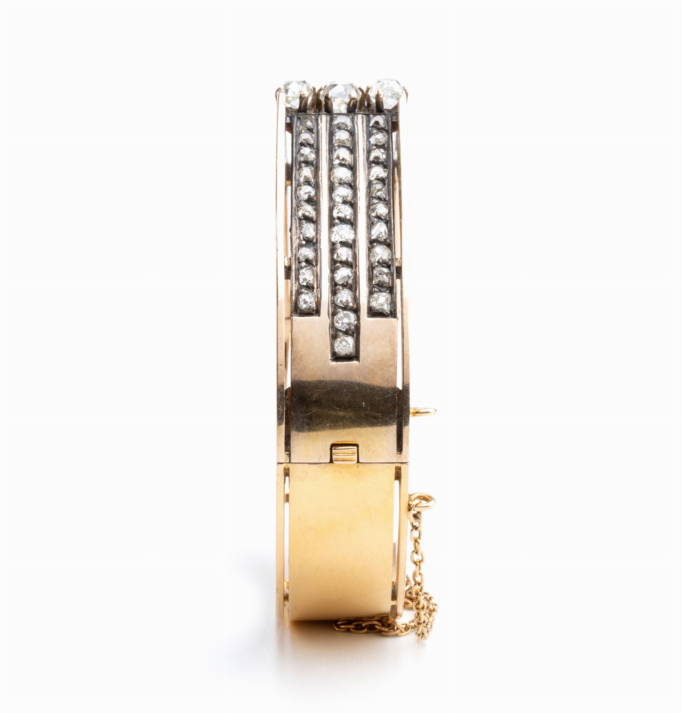 in oro giallo 18k, manifattura francese.N. 64 diamanti, forma irregolare, taglio old mine, circa 5.20 ct.Punzonature francesi per il titolo 750/1000. Diametro interno massimo 6 cm. Peso 55,8 gr.Stato di conservazione: **** buono.