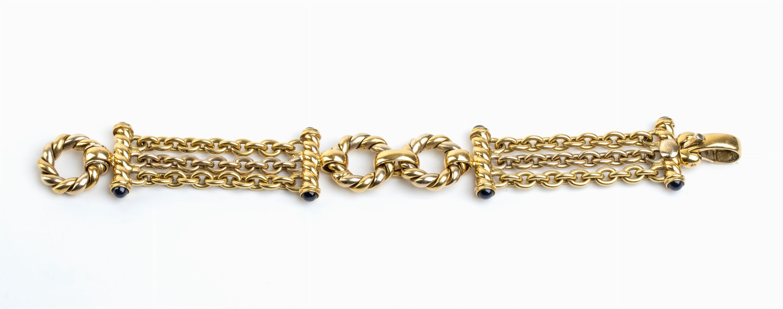 con catena a maglia forzatina e maglie a cordonetto in due colori d'oro 18k. Dettagli in cabochon di zaffiri.Firmato GOLDEN POINT.Punzonato 750 - 580 AR. Lunghezza 20,5 cm. Peso 42 gr.Stato di conservazione: ***** eccellente (come nuovo).