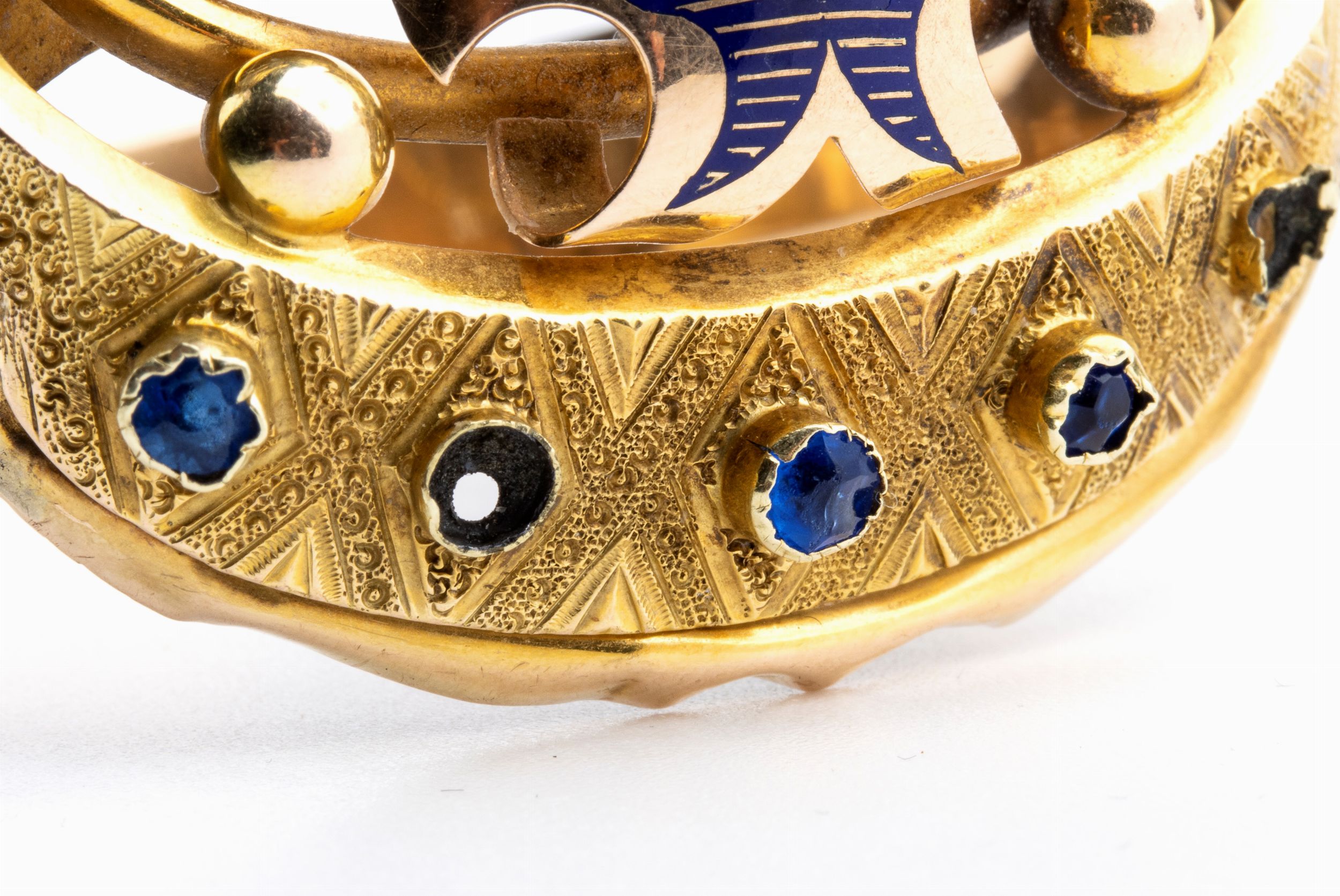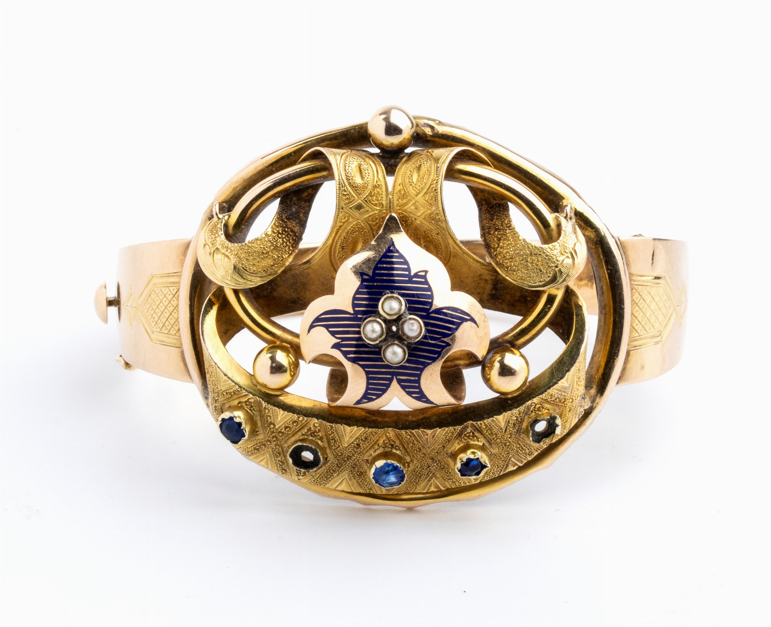 a fascia rigida in oro giallo 14k, con motivo centrale di nastri e decori incisi a motivi vegetali, applicazione di smalti, paste vitree blu e perle di fiume.