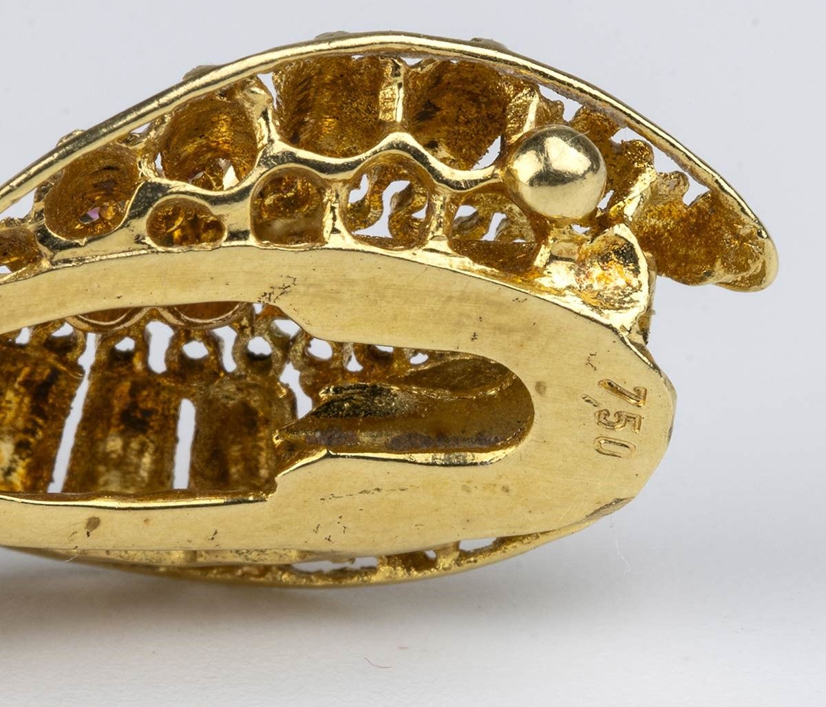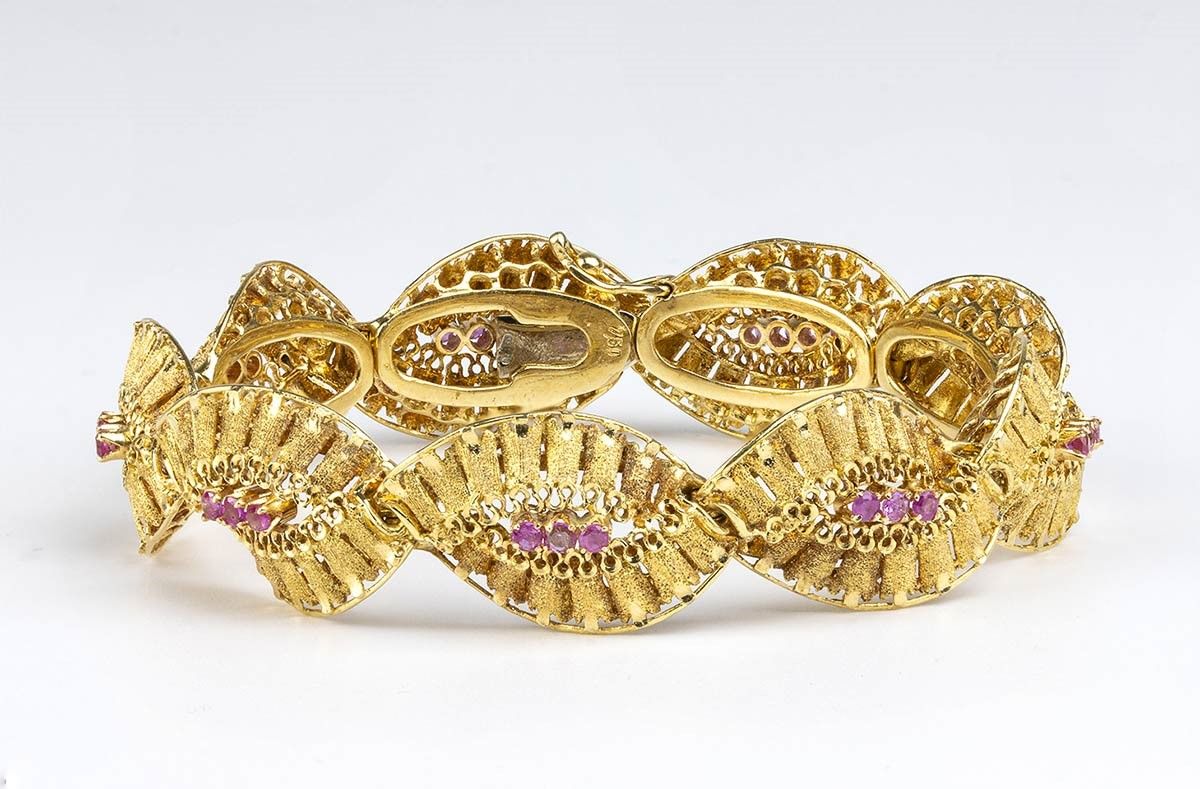 oro giallo 18k, con motivo di nastri e linea di rubini.N. 27 rubini di forma rotonda, taglio composito 1.10 ct circa.Punzonato 750. Lunghezza 18 cm. Peso 25.7 gr.Stato di conservazione: **** buono.
