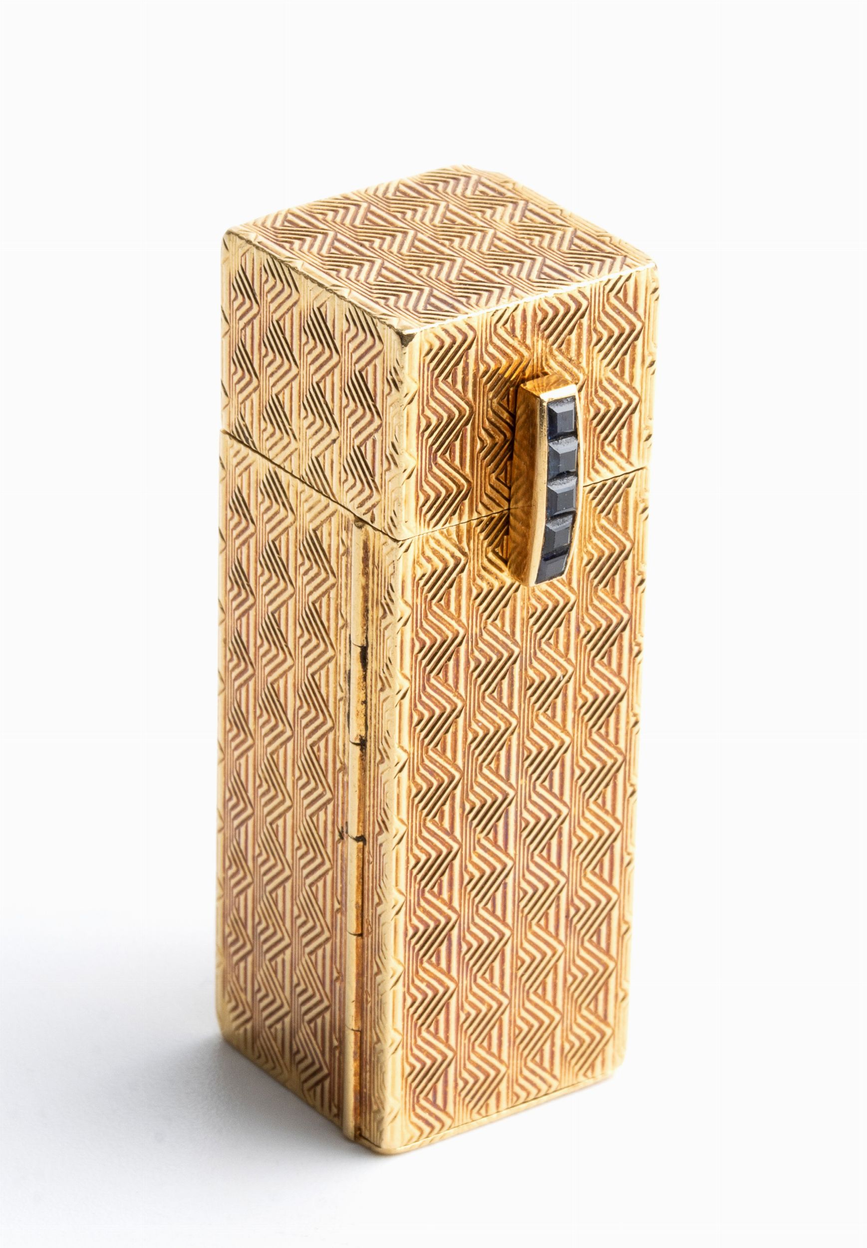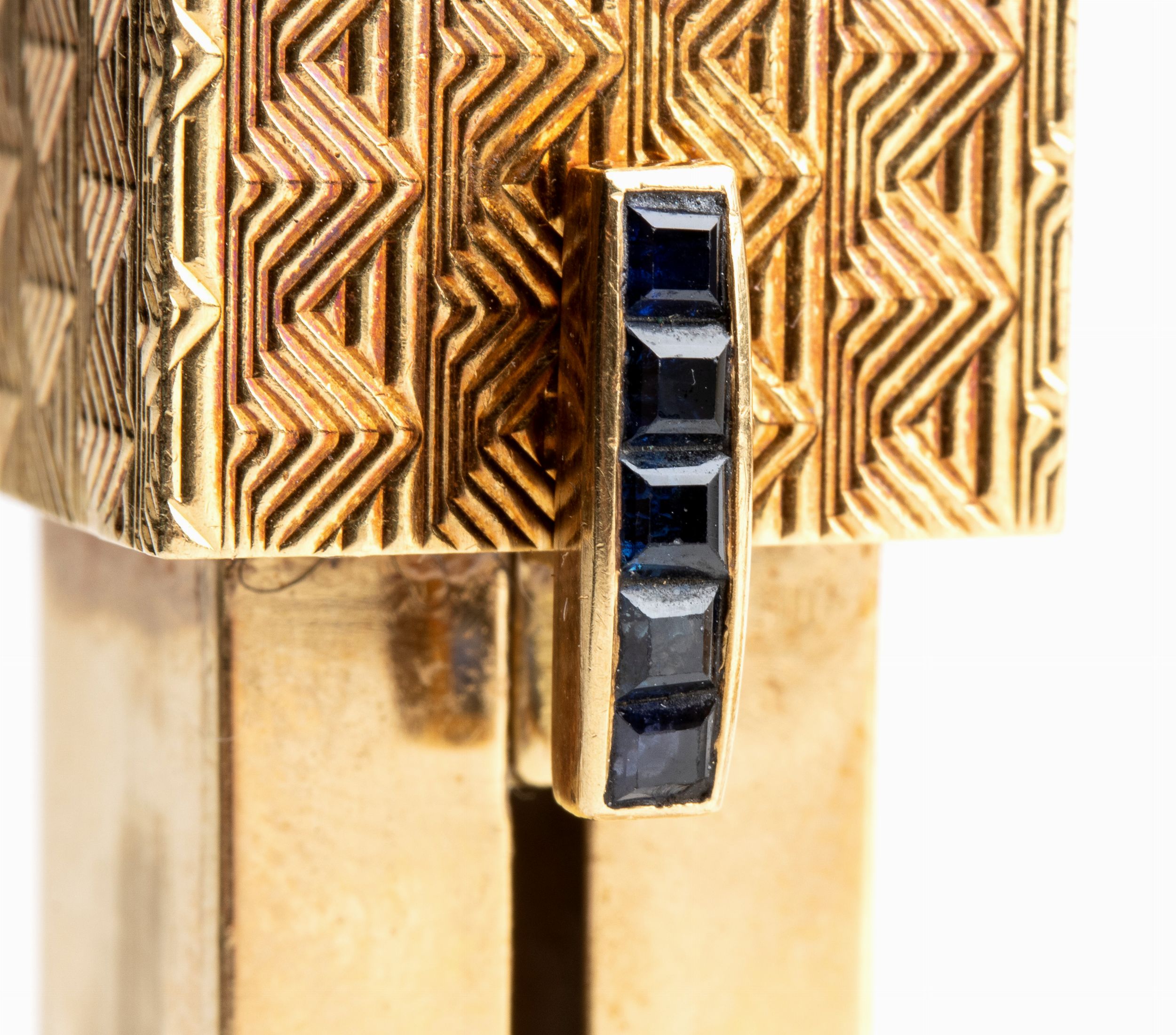di forma rettangolare, in oro giallo 18k decorato a motivi geometrici, chusura incastonata con 5 corindoni varietà zaffiri, di forma quadrata, taglio carré.- Punzonato S. BVULGARI - 750 e con marchi di importazione in Inghilterra.