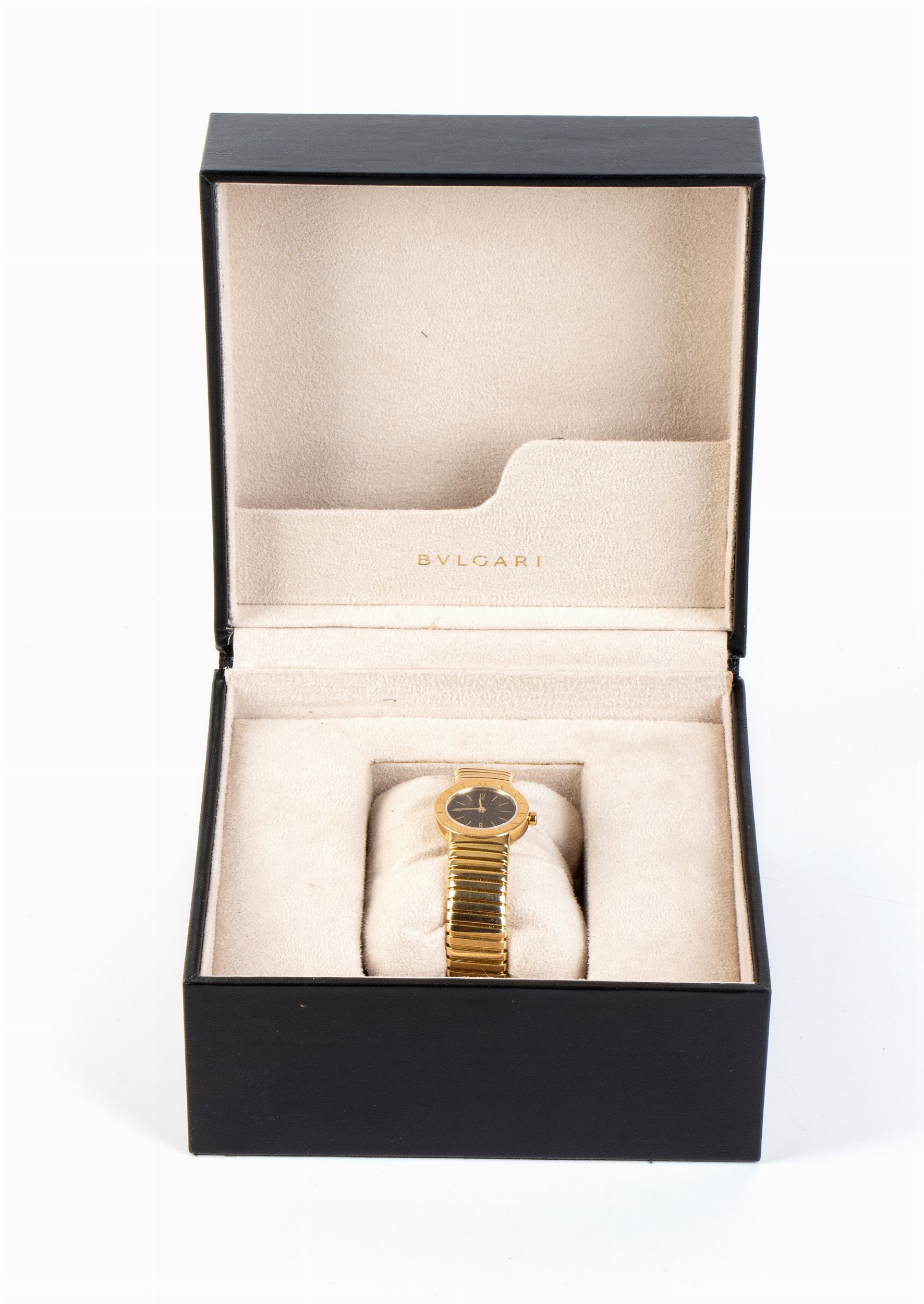 orologio con bracciale integrale maglia tubogas in oro 18K con fermezza di sicurezza a scomparsa. Quadrante nero con indici e sfere dorate, movimento al quarzo Eta 956112. Riferimenti sul fondello BB232T e P.91531.