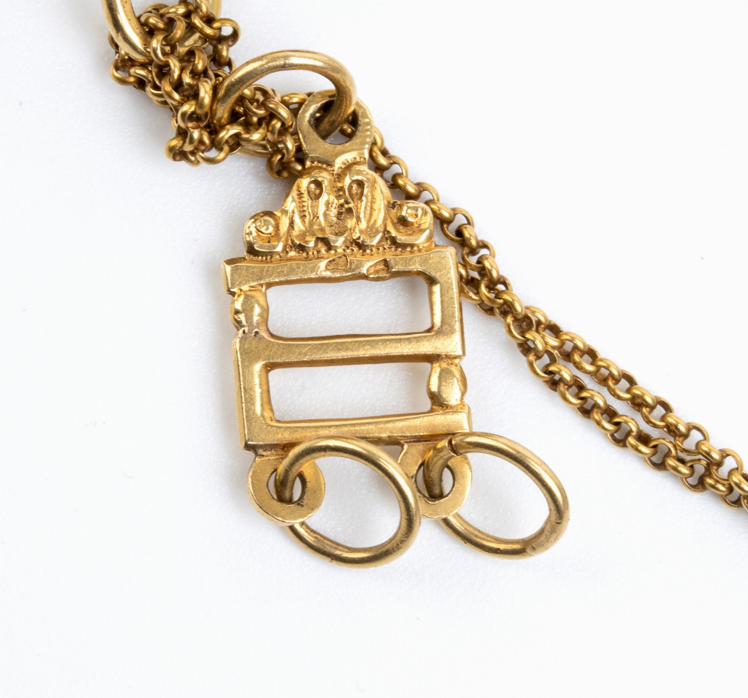 con catena a maglia rolo' e fermacravatta a lastra in oro giallo 18k. Punzoni francesi di garanzia per il titolo 18k. Peso 18.8 gr.Stato di conservazione: **** buono.