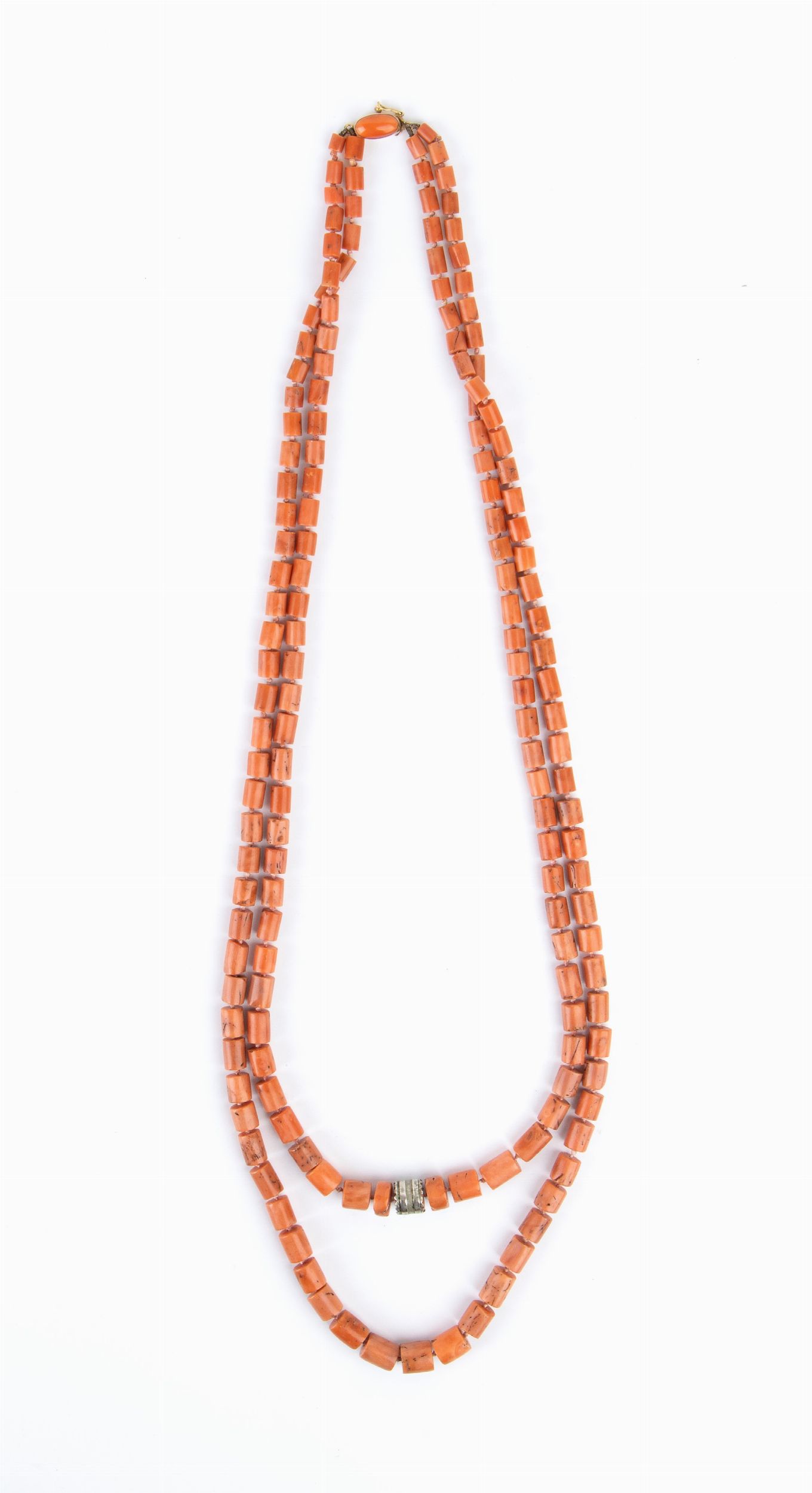 a due fili di barilotti di corallo Mediterraneo (corallium rubrum) disposti in gradazione, fermezza in oro giallo.Lunghezza 78 cm. Peso 110 gr.Stato di conservazione: **** buono.