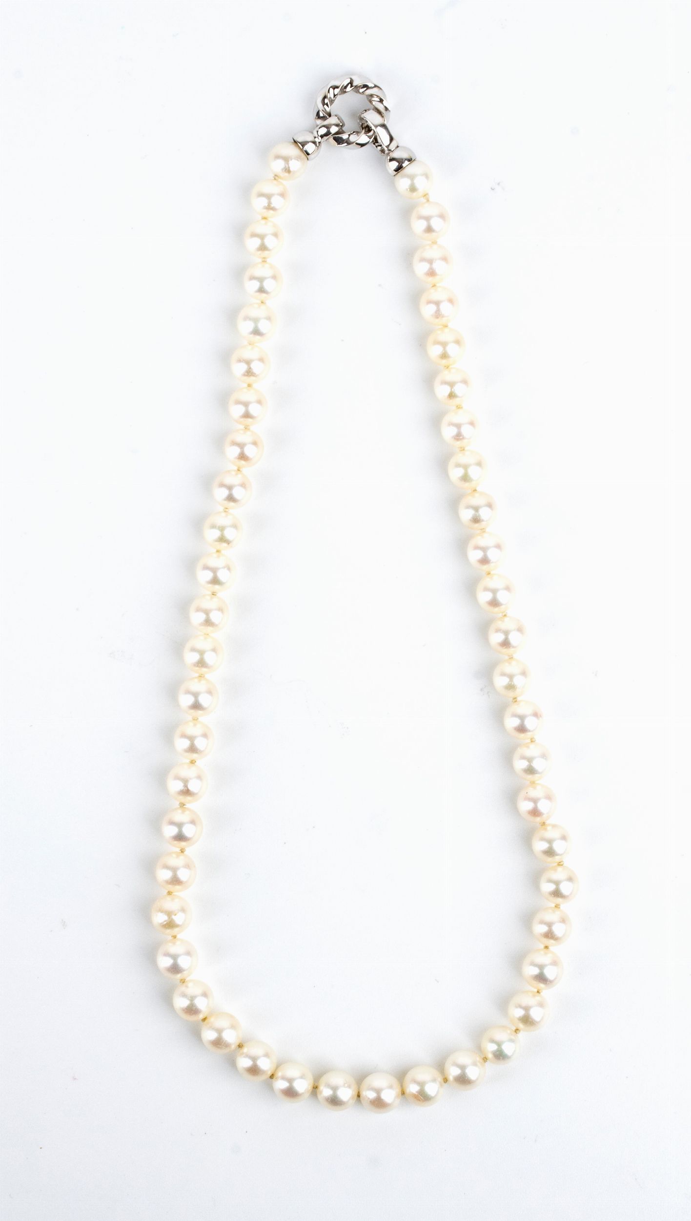 ad un filo di perle coltivate d'acqua salata con chiusura a moschettone in oro bianco 18k.Punzonata 750. Diametro perle 8-8,5 mm. Lunghezza 46 cm. Peso 44 gr.