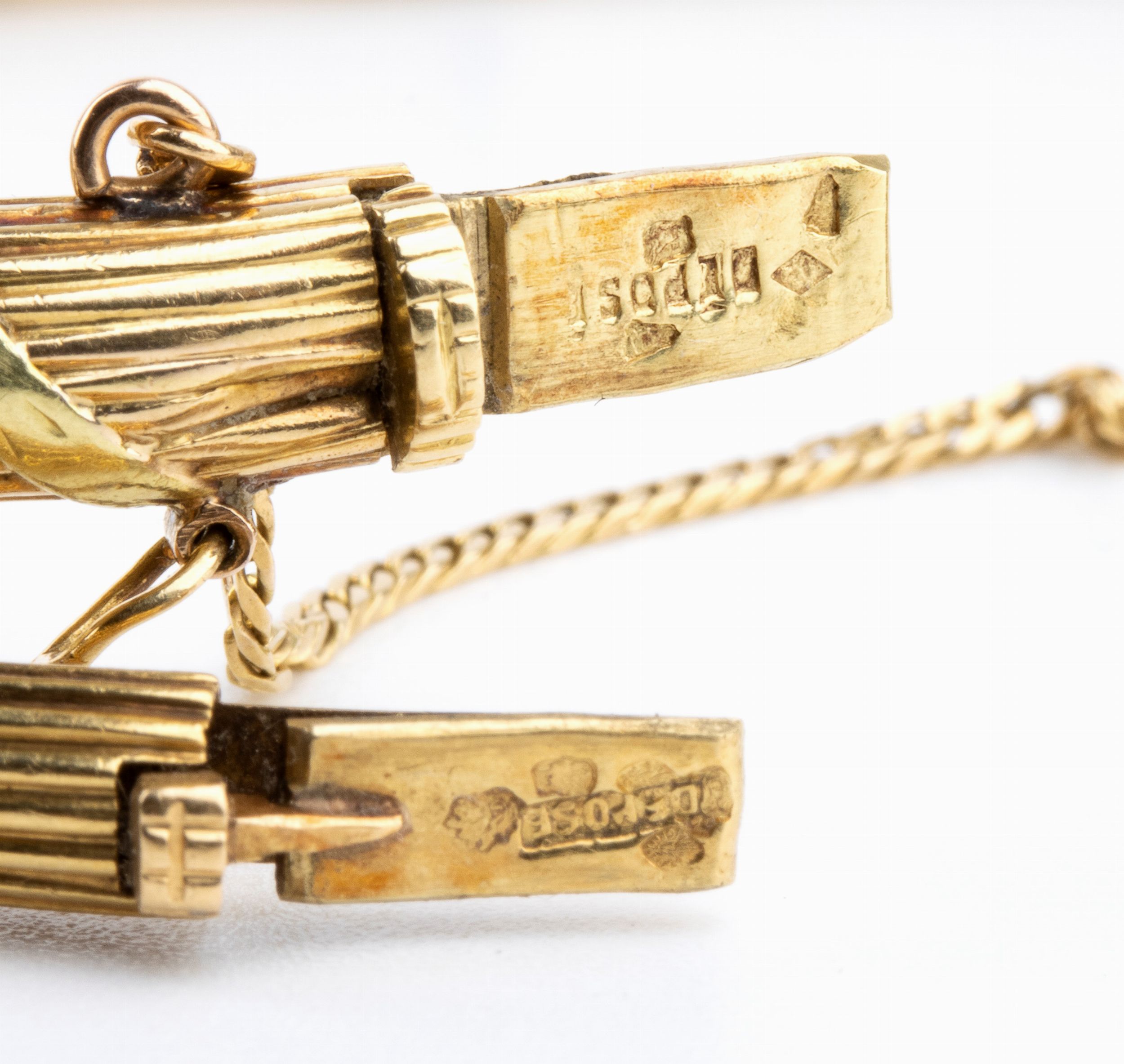 a cerchio rigido in oro giallo 18k, con motivo di nastri. Punzonato DEPOSE' e con punzonature francesi per il titolo 750/1000. Diametro interno 6 cm. Peso totale 28 gr. Stato di conservazione: **** buono.