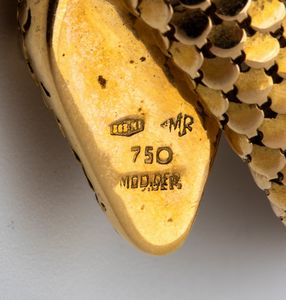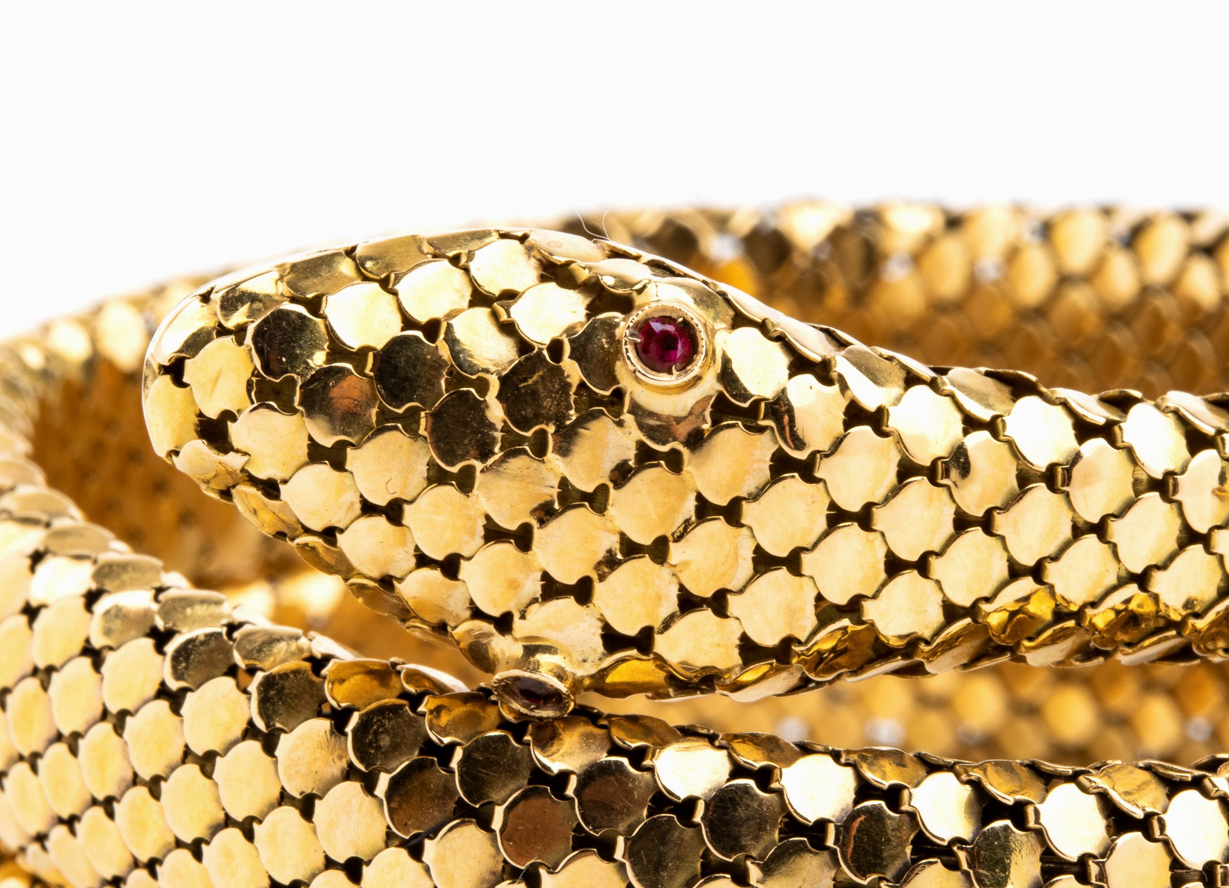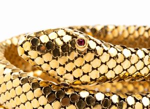 in oro giallo 18k, motivo a serpente a maglia tubolare con lavorazione a squame.Punzonati 750 - MR - MOD. DEP.Lunghezza collana 43 cm. Peso girocollo 52,4 gr. Peso bracciale 68,6 gr. Stato di conservazione: ***** eccellente.