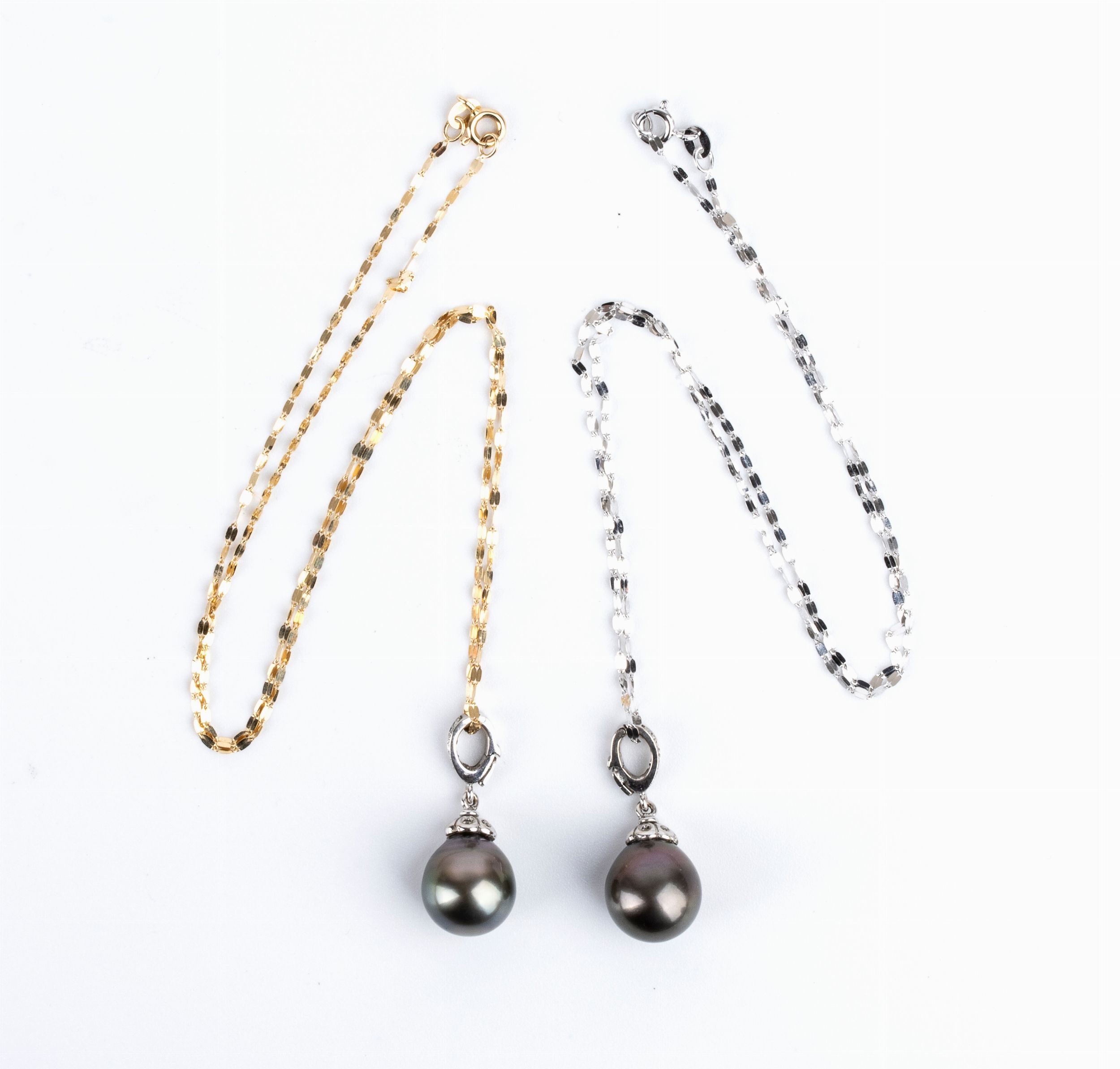 in oro giallo ed oro bianco, ciascuno con perla Tahiti pendente, sormontata da diamante.