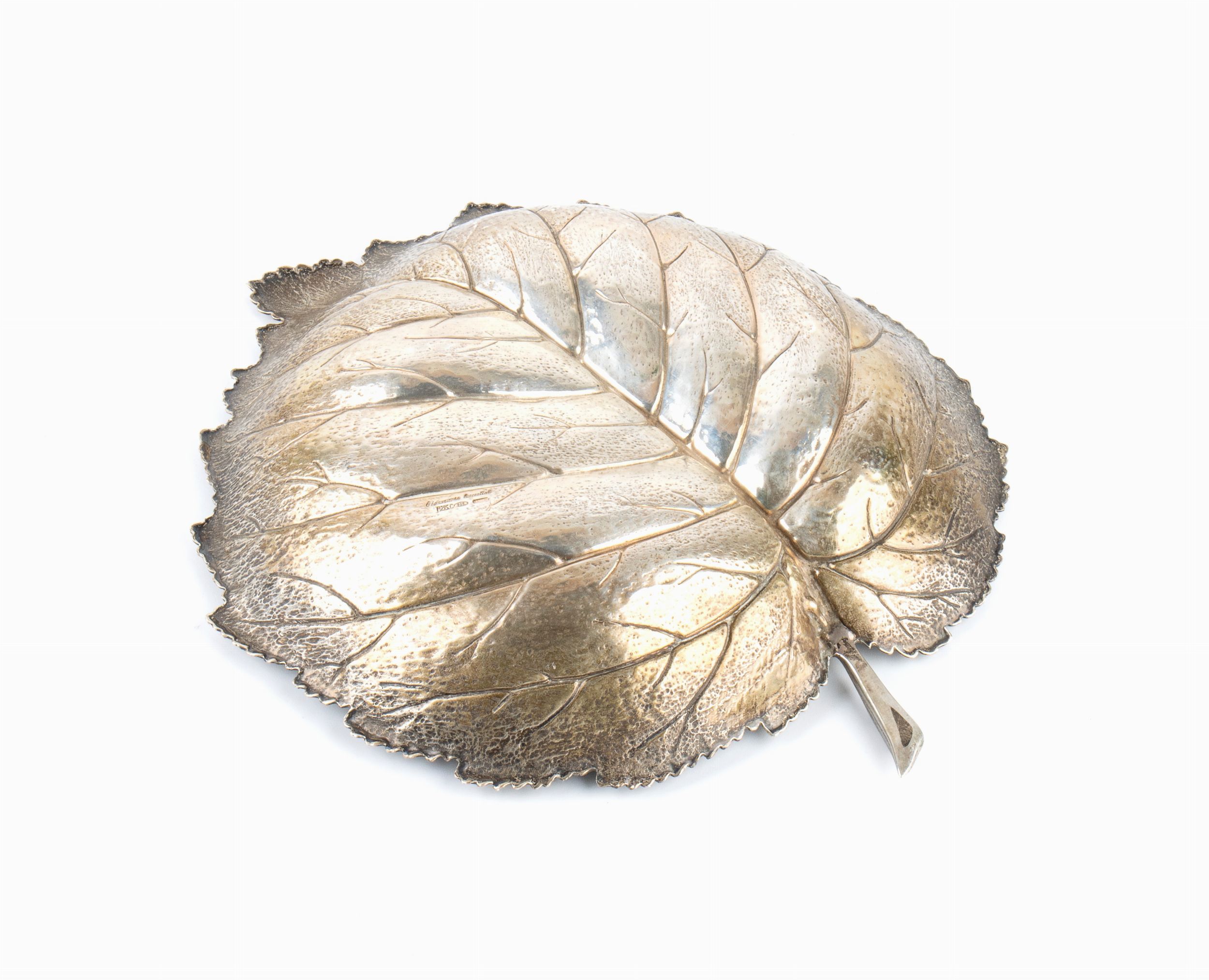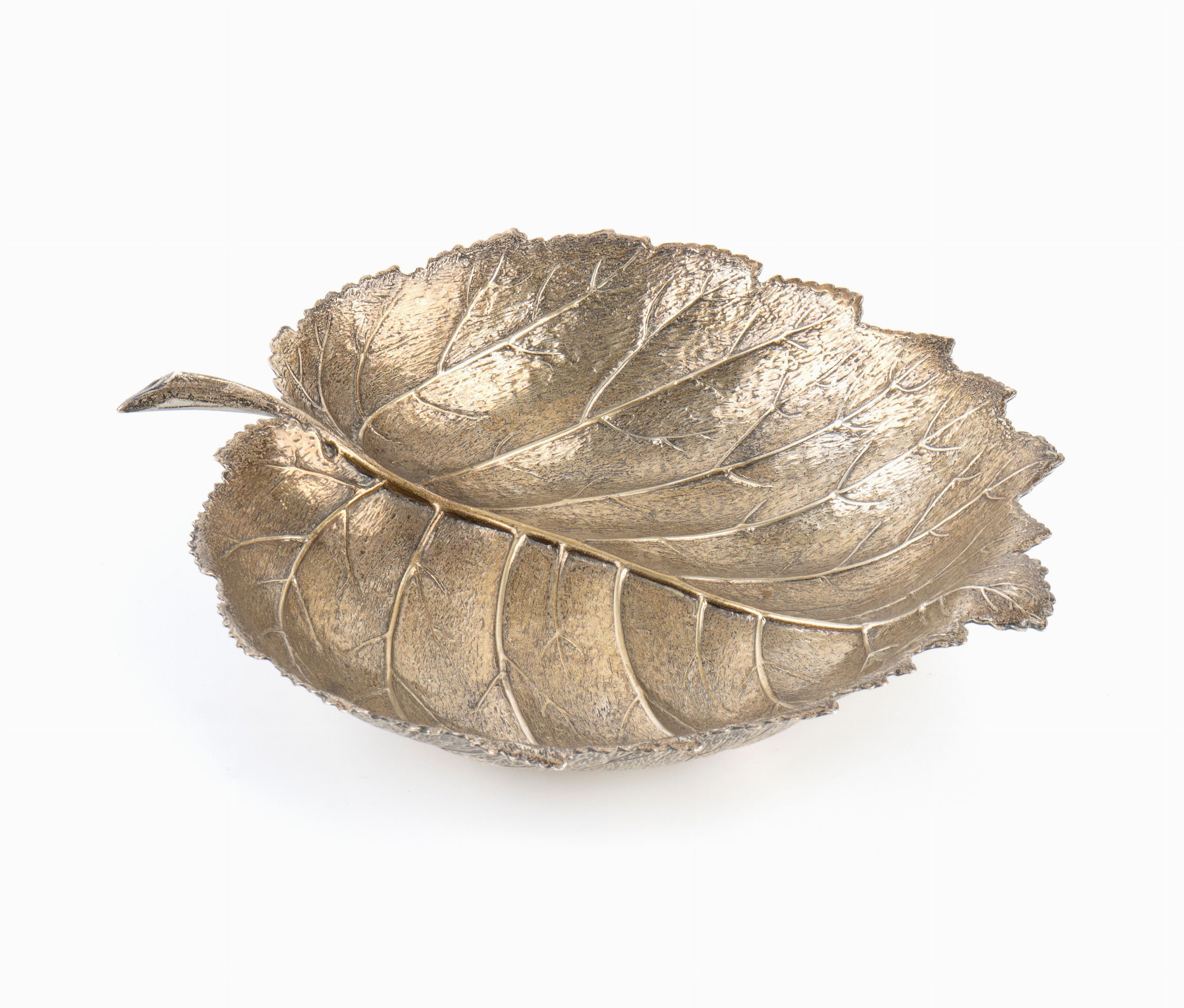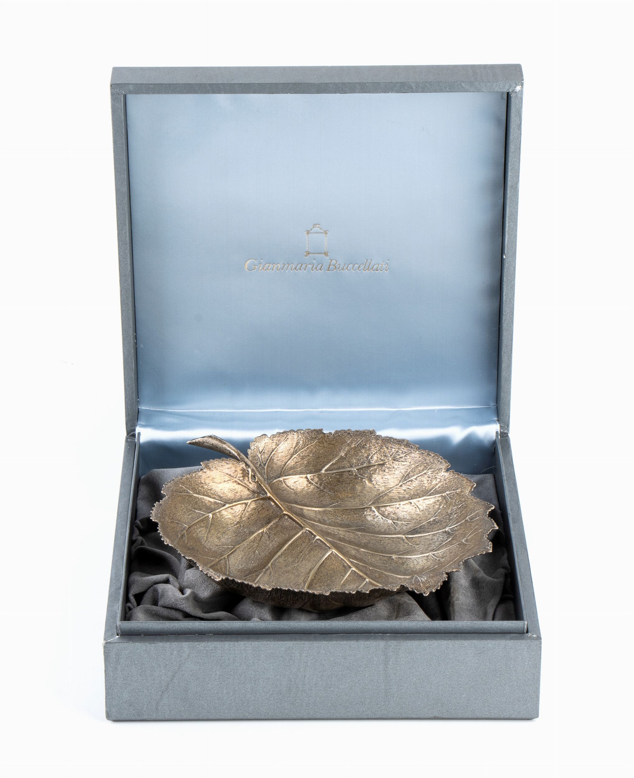 a forma di foglia di nocciolo. Argento 925/1000 punzonato Giamaria Buccellati - 925 - * 1 BO. Altezza x larghezza x profondità: 3,5 x 18 x 21 cm. Peso 267 gr. Scatola originale. Stato di conservazione: ***** eccellente.