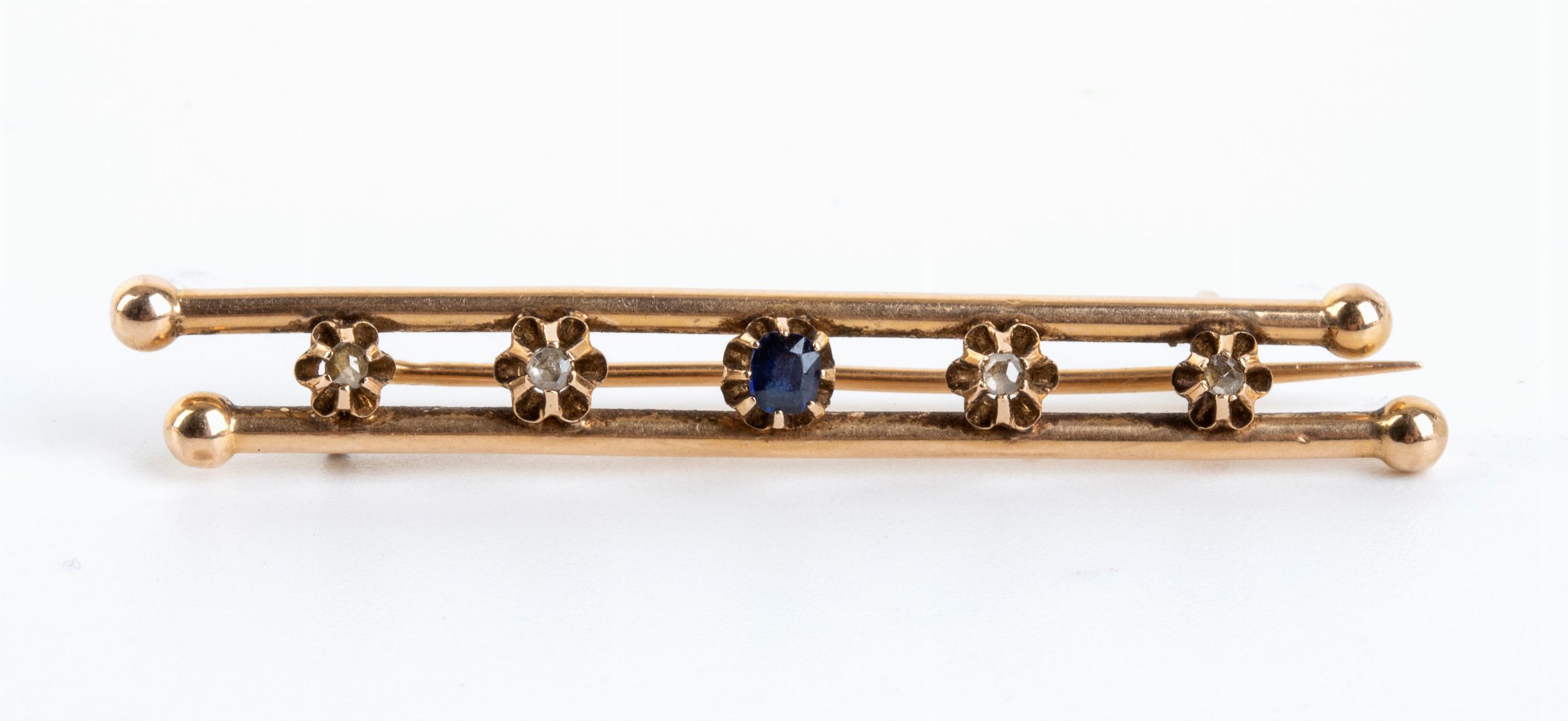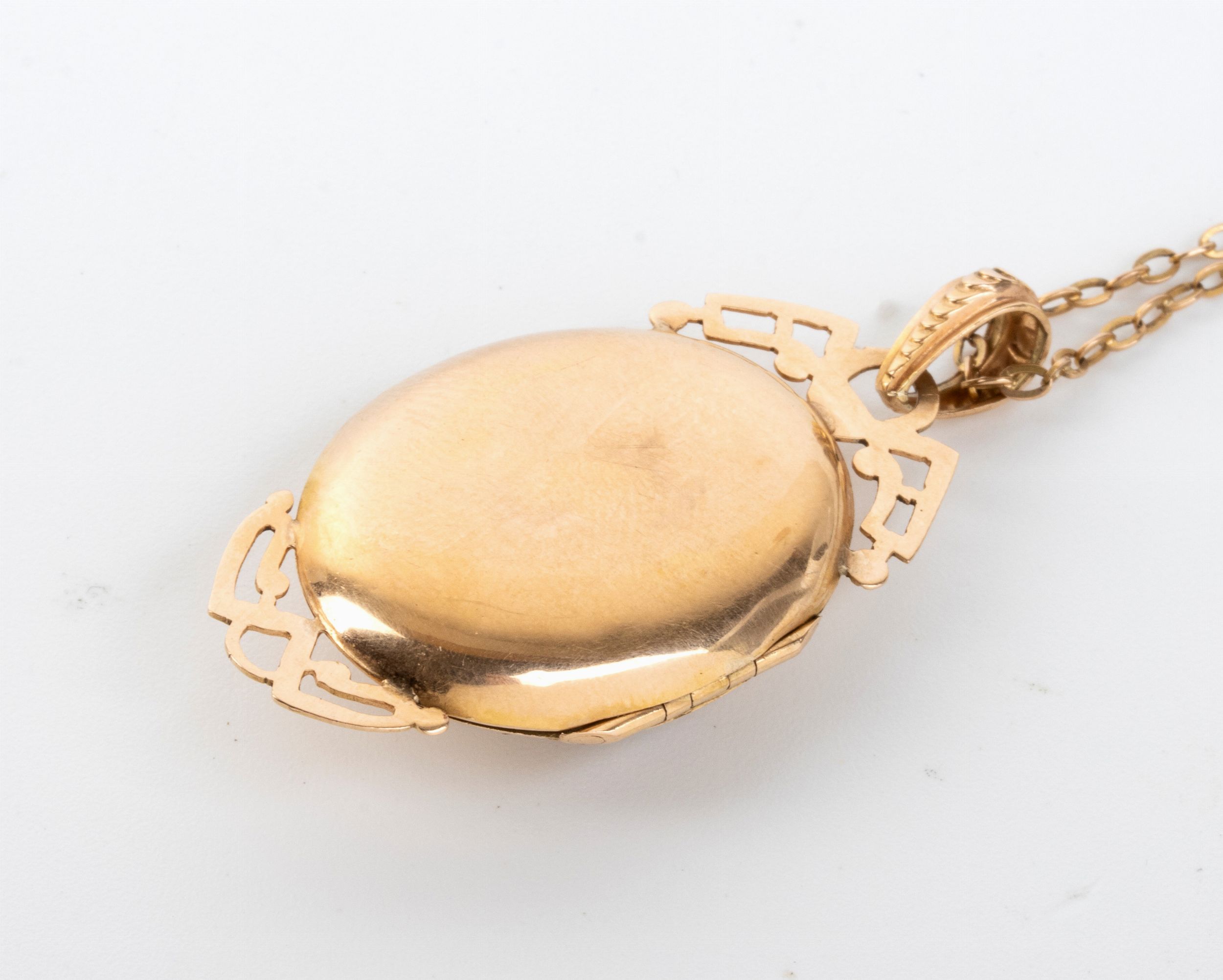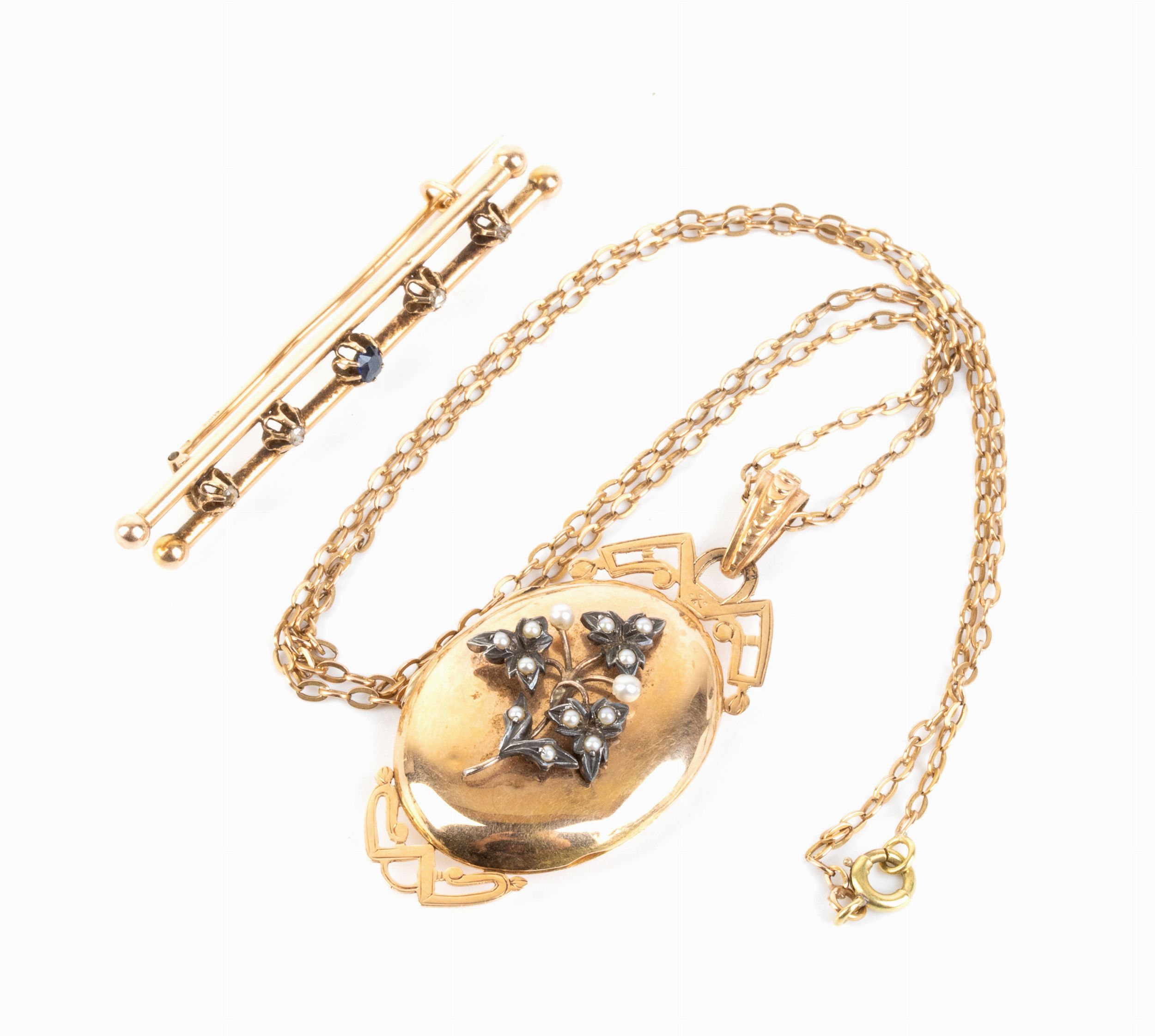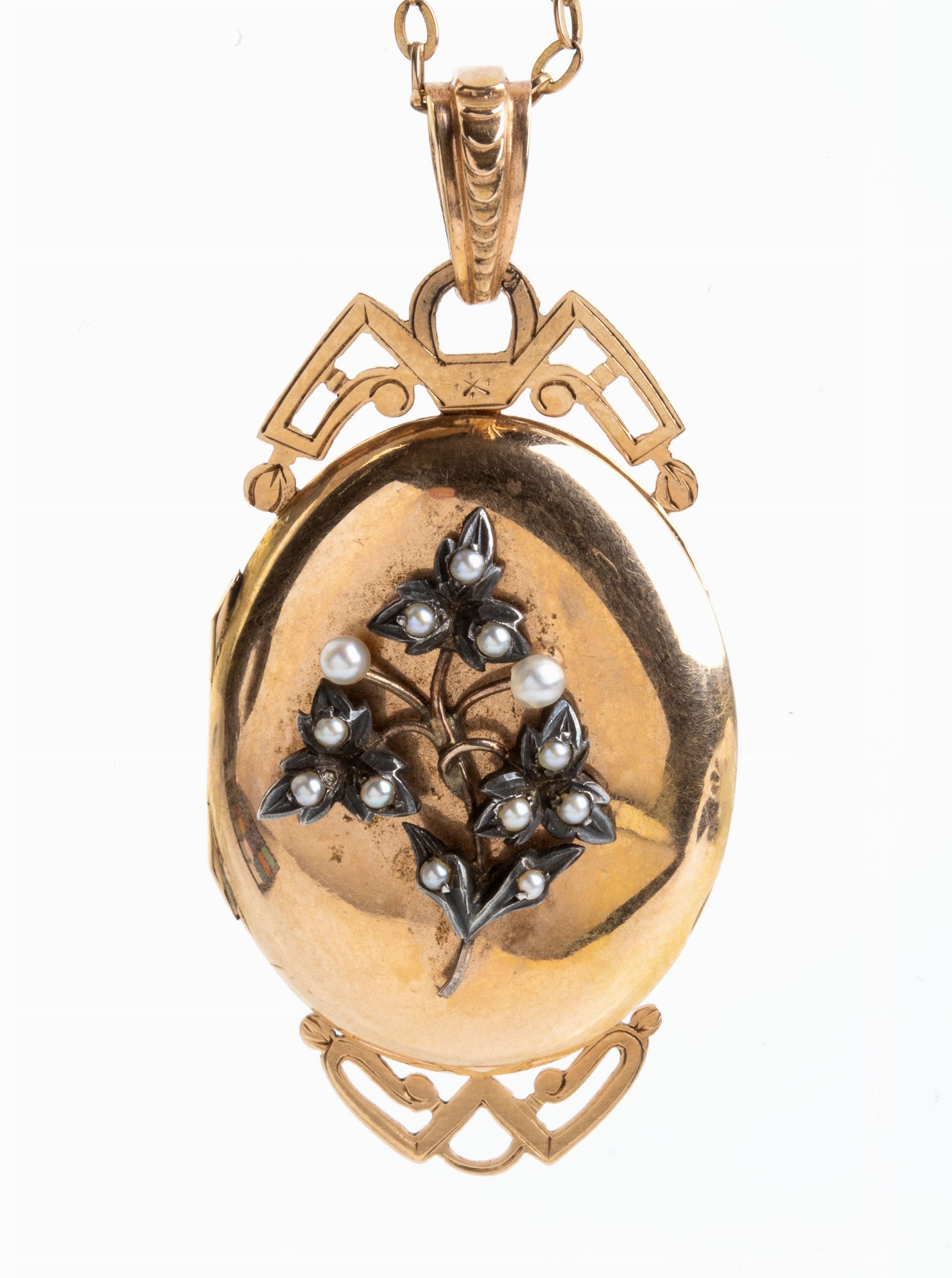 la spilla presenta cinque pietre incastonate in griffe a motivo floreale e il pendente, apribile in un porta foto, è decorato con un motivo floreale e steli con perline.