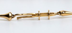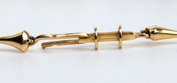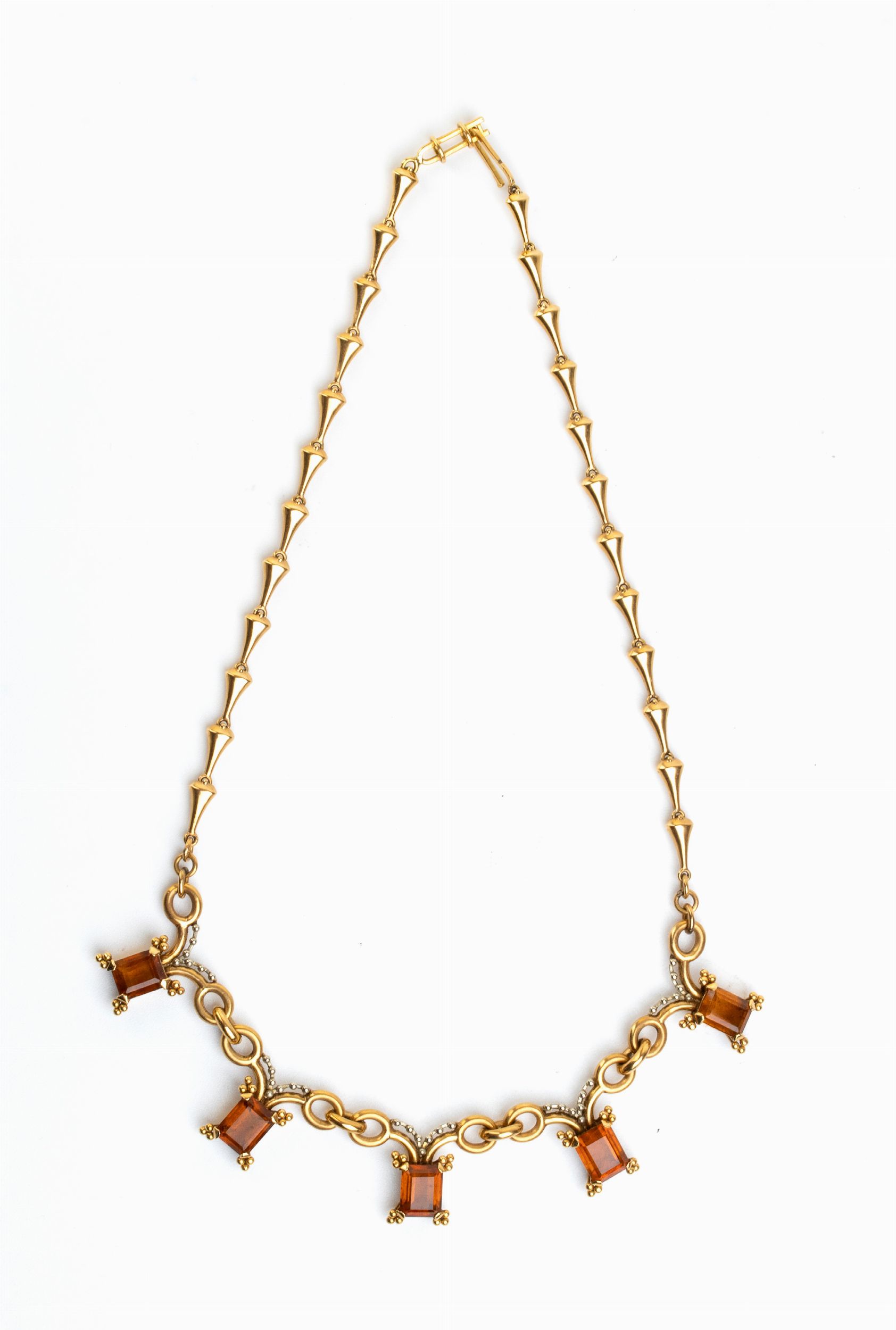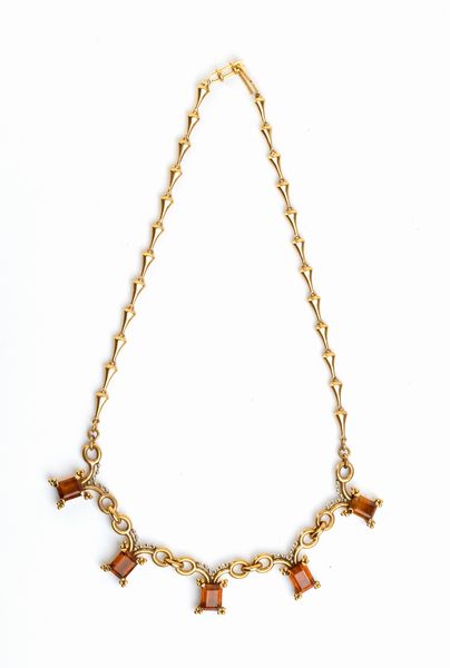 sezione centrale con catena in maglie ad anelli, dettagli in piccole sfere e frangia di quarzi citrini. Lunghezza 40 cm. Peso 24,6 gr.Stato di conservazione: **** buono.