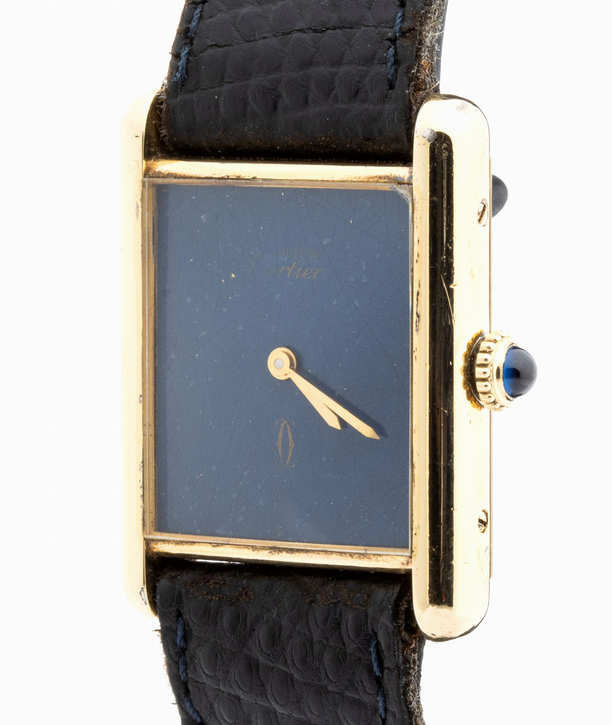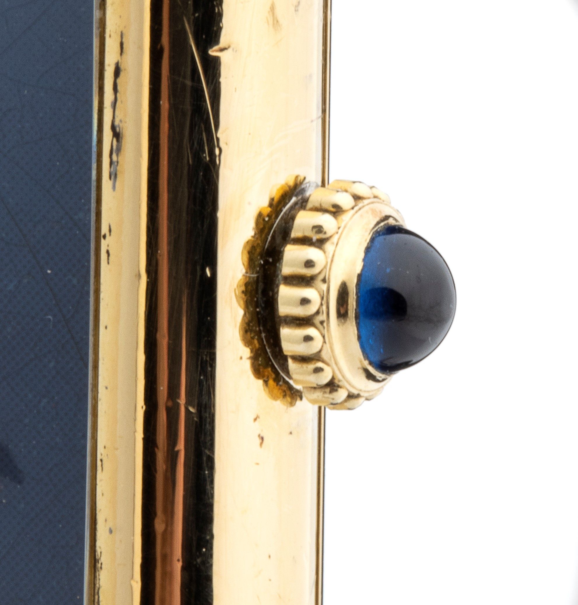 cassa rettangolare in argento dorato, quadrante in lapislazuoli con sfere dorate, corona di carica con zaffiro cabochon, movimento meccanico a carica manuale. Matricola sul fondello 6 181410.