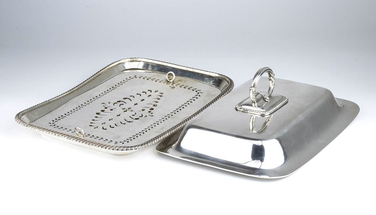 di forma rettangolare con bordo godronato. La vaschetta di scolo interna sopra il vassoio consente agli asparagi di rimanere consistenti e caldi con l'aggiunta di acqua calda nello scomparto più in basso. La legumiera può essere utilizzata anche senza il vassoio interno. Argento 925/1000, serie completa di marchi Londra 1896-1897, argentiere Maxfield & Sons.