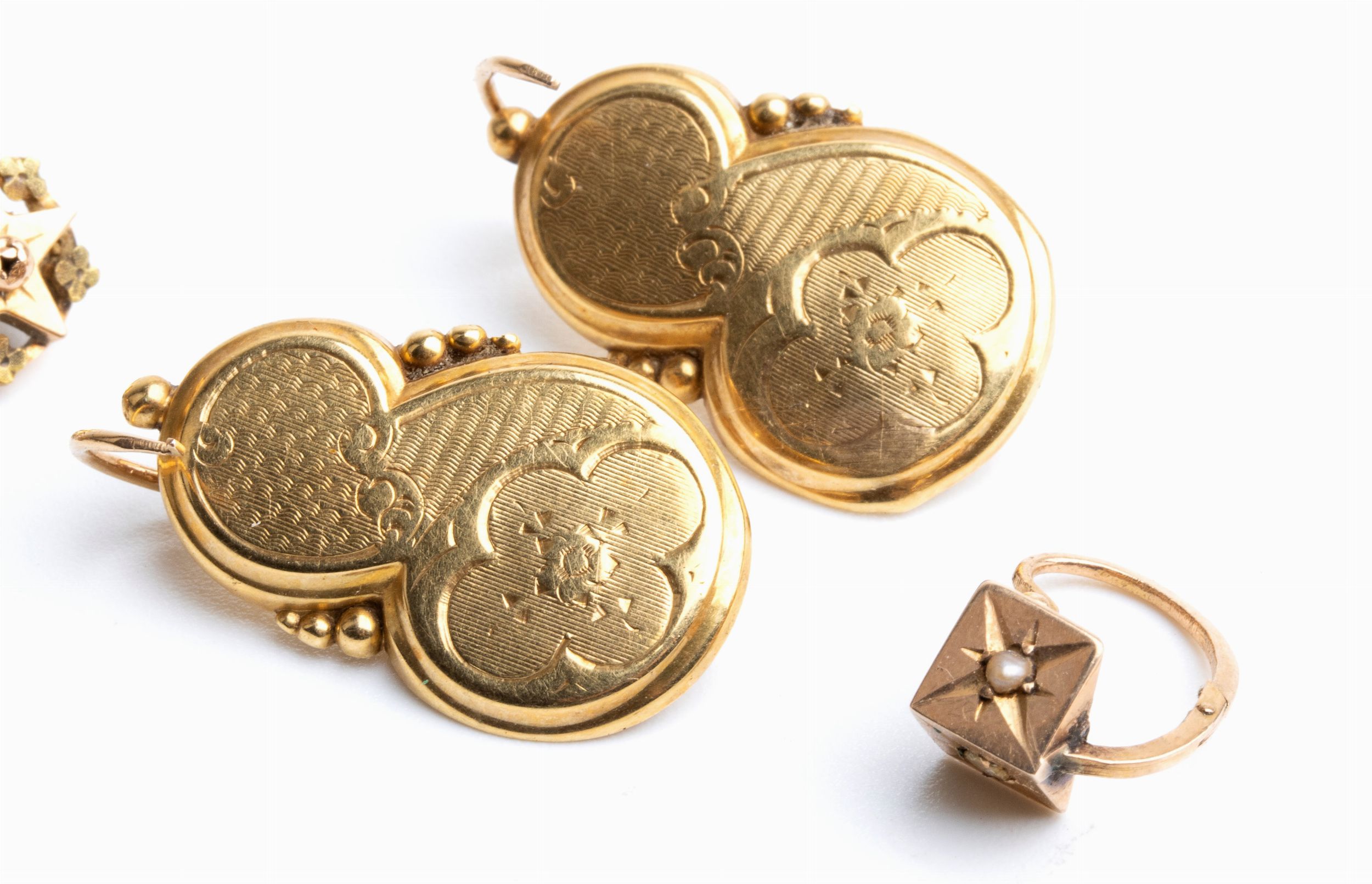 a) orecchini a forma di S con decorazioni floreali e geometriche. Dimensioni 3 x 1,6 cm;
