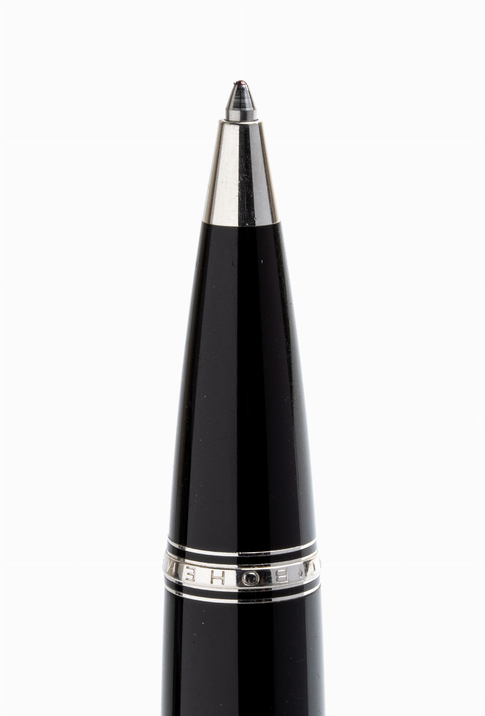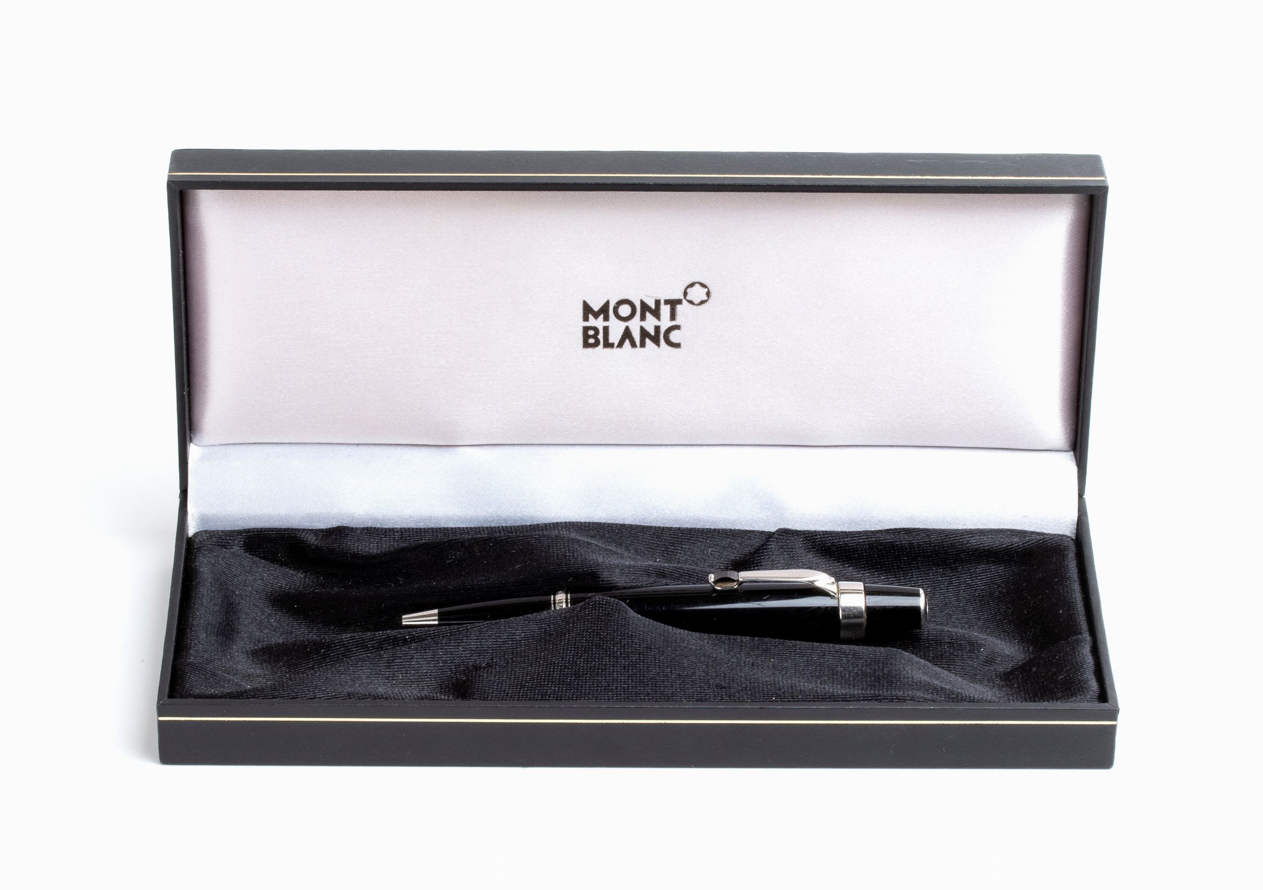 meccanismo a rotazione, corpo in pregiata resina nera, stella bianca Montblanc intarsiata, finiture platinate e clip con onice nero incastonato. Punzonata Montblanc Boheme, seriale KZ2020667 Germany. Lunghezza 11 cm . Peso 23,40 gr. Scatola Montblanc. Stato di conservazione: **** buono, minor segni d'uso. La penna potrebbe necessitare del cambio del refill.