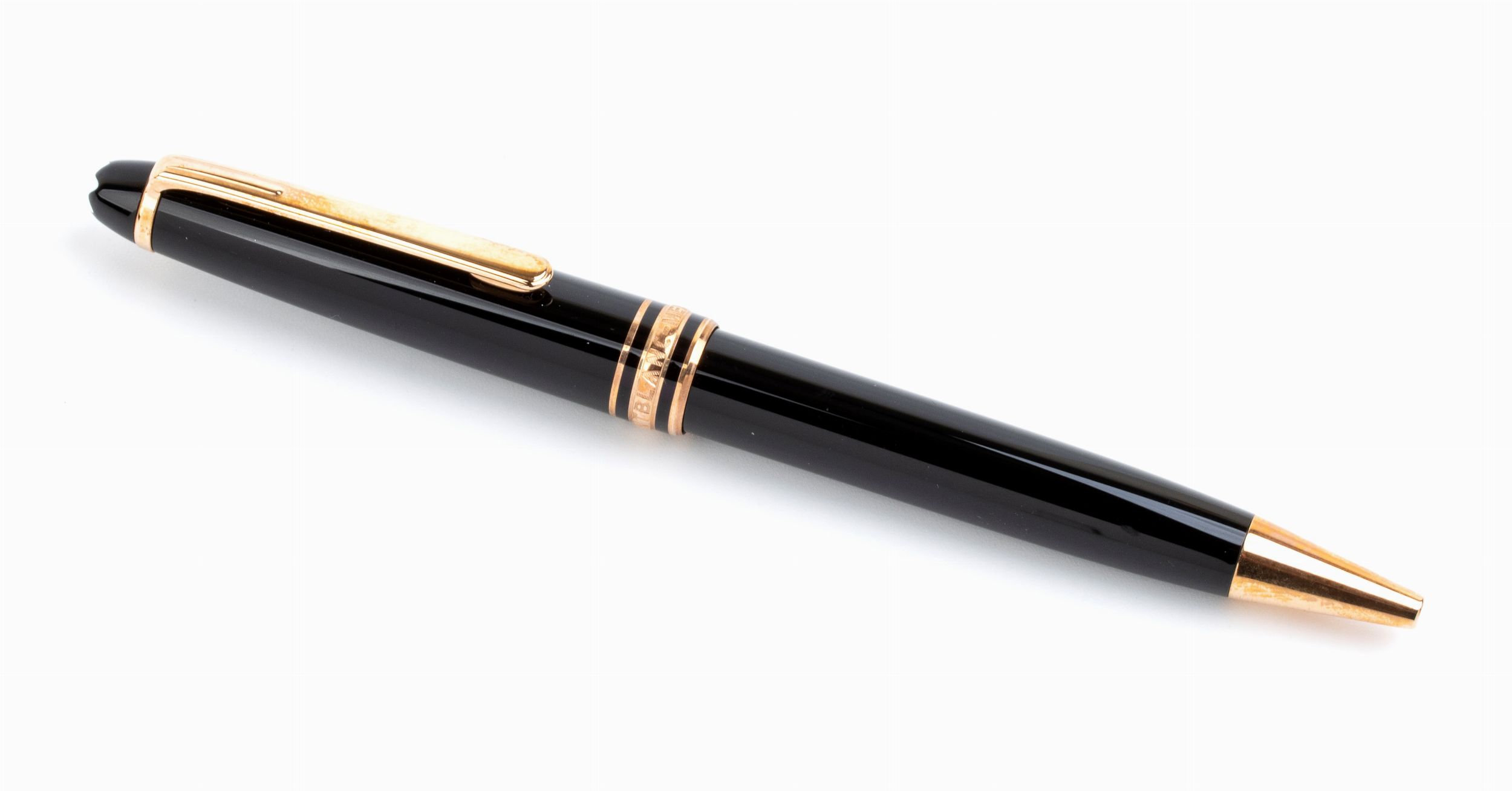 meccanismo a rotazione, corpo in pregiata resina nera, stella bianca Montblanc intarsiata, finiture e clip dorate. Punzonata Montblanc Meisterstuck, seriale MBNG3DVS2, made in Germany. Lunghezza 13,5 cm . Peso 22,70 gr. Scatola Montblanc. Stato di conservazione: **** buono, minor segni d'uso. La penna potrebbe necessitare del cambio del refill.