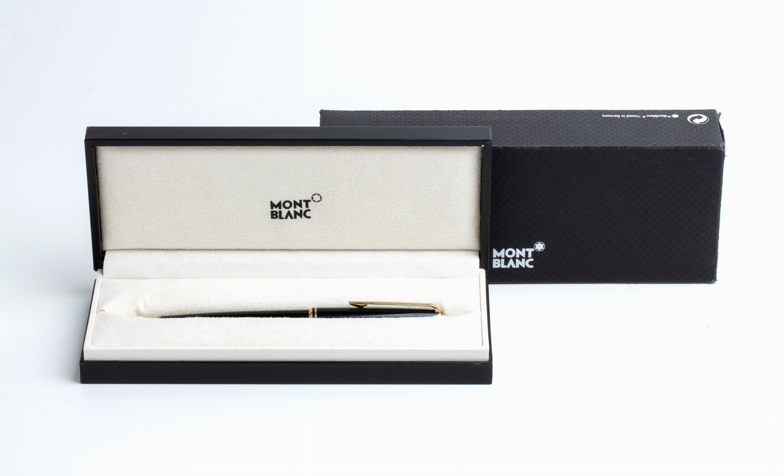 corpo in pregiata resina nera, stella bianca Montblanc intarsiata, finiture e clip dorate, pennino in oro 18k riportante la dicitura 14K - 585 - logo Montblanc. Punzonata Montblanc Classic Germany.