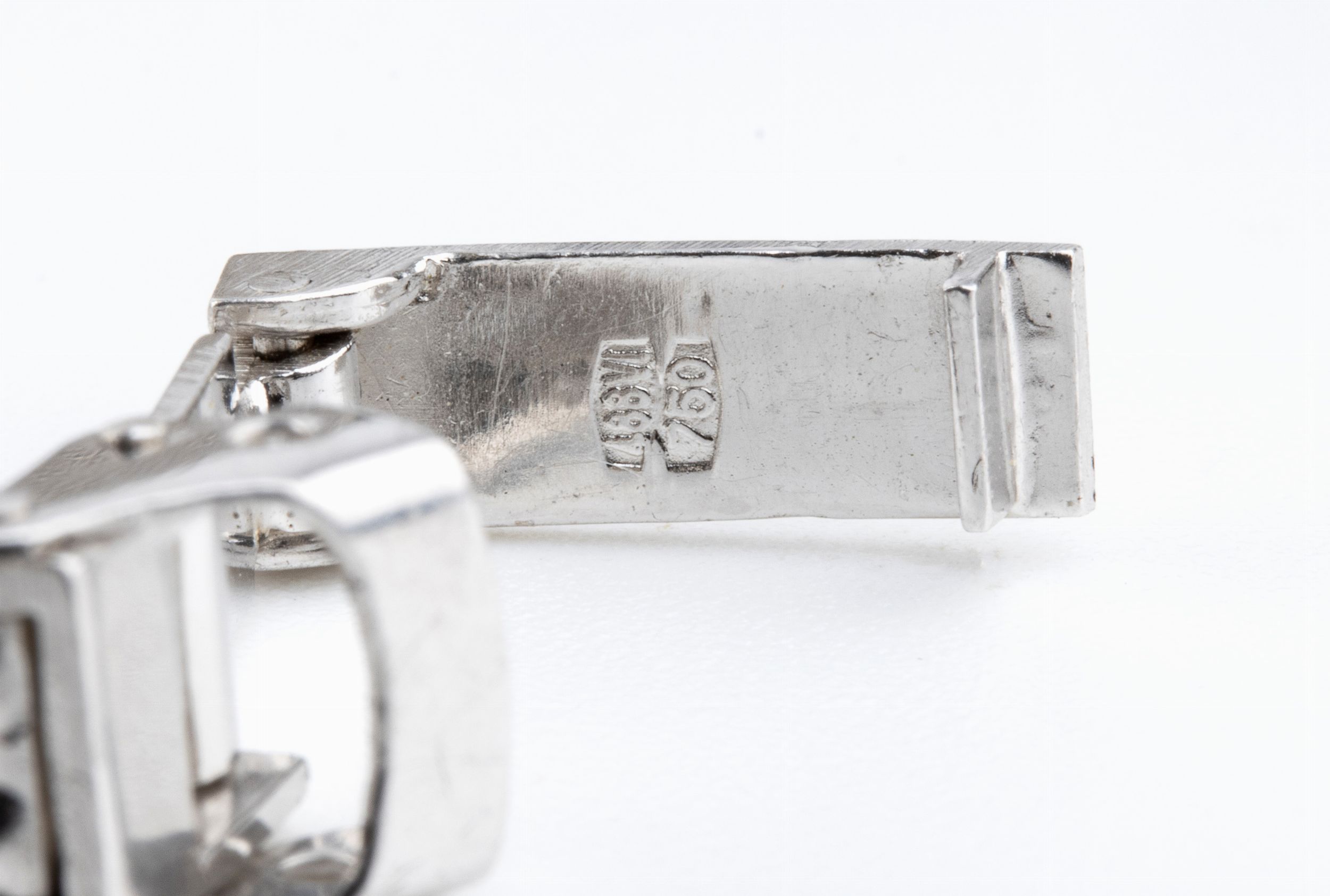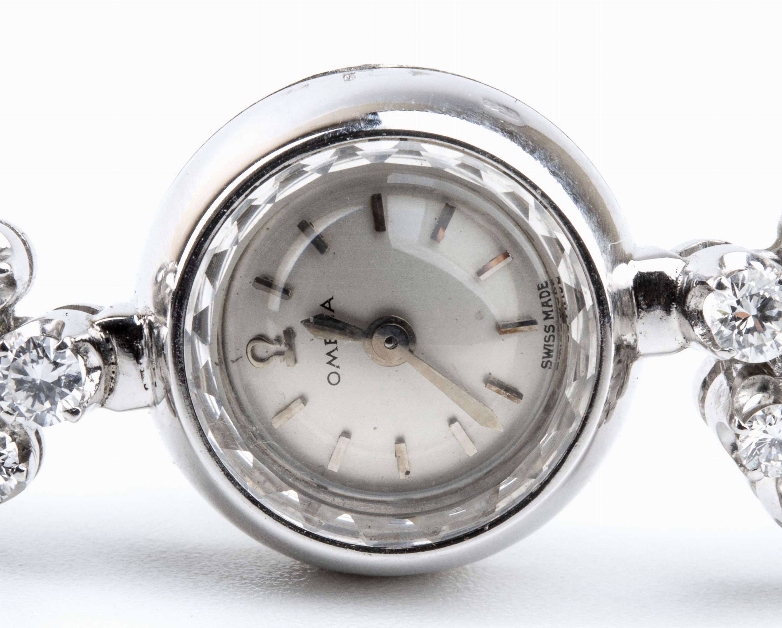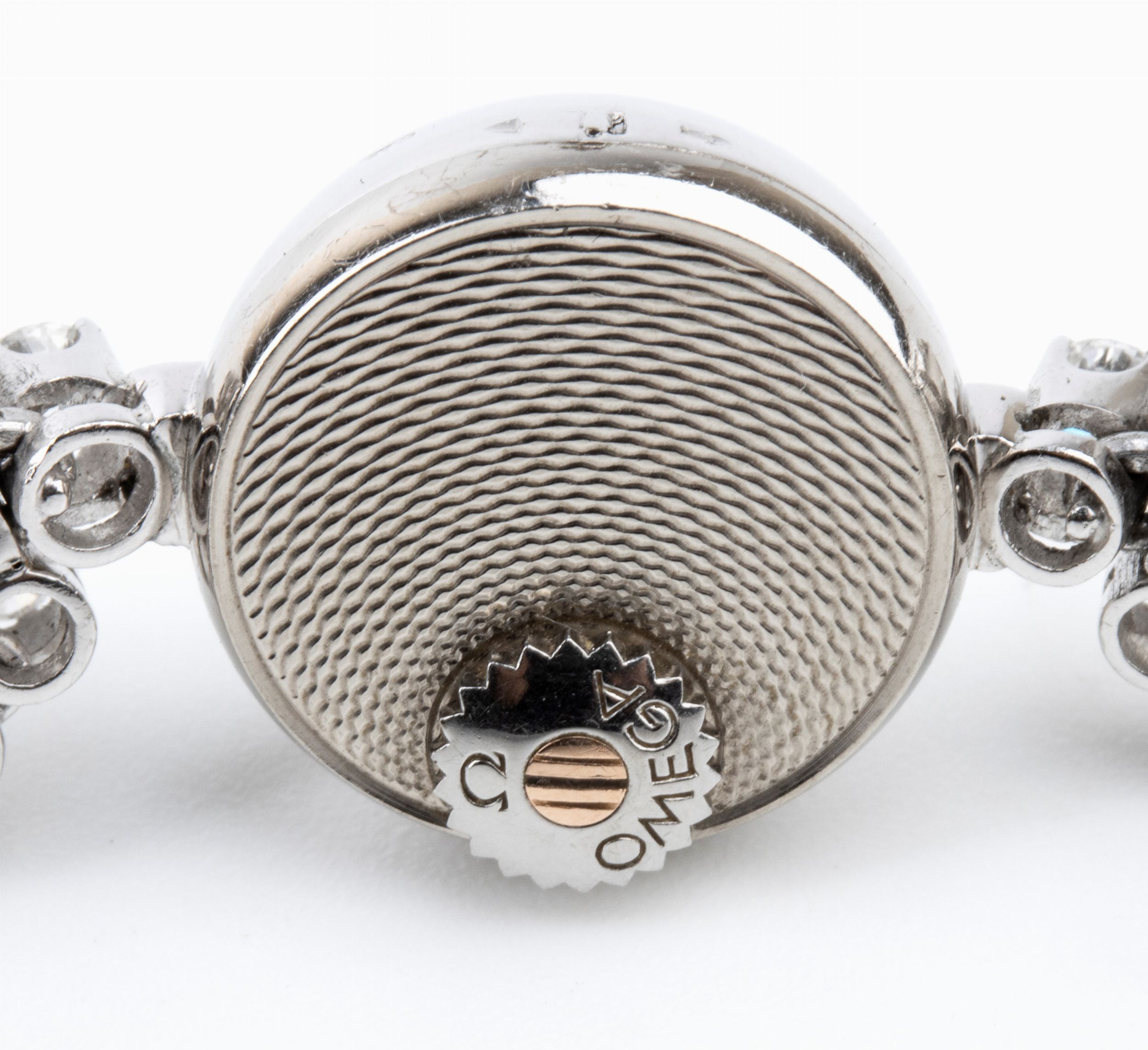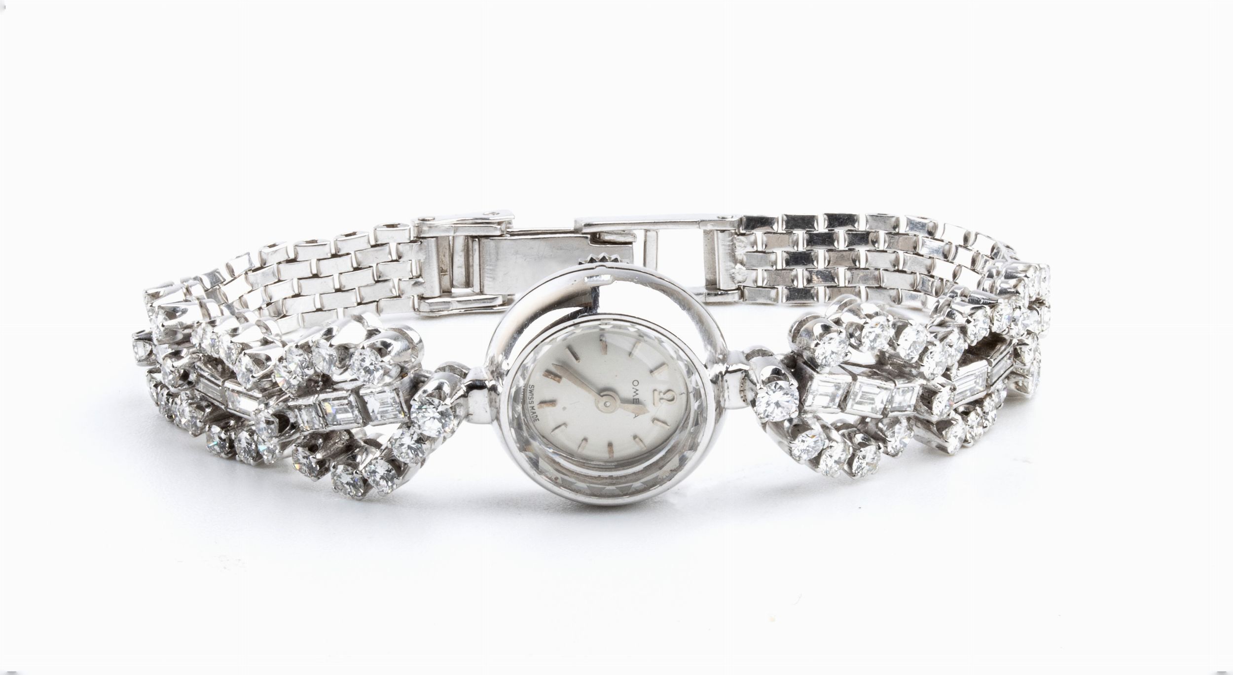 cassa orologio Omega in oro bianco 18K, cinturino in oro bianco e platino incastonato con diamanti vario taglio. Movimento meccanico a carica manuale con corona sul fondello. Chiusura in oro bianco 18k.