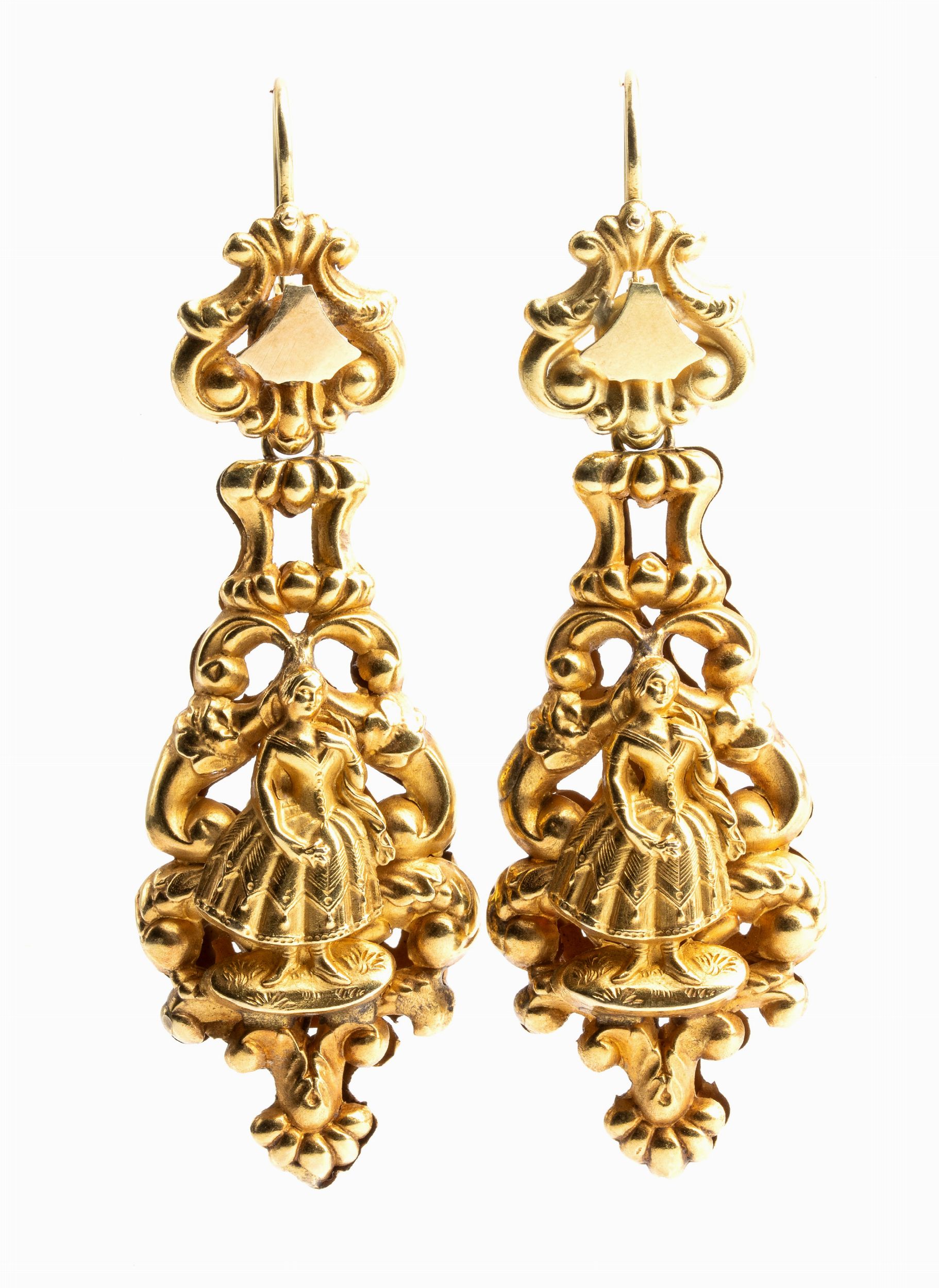 antichi orecchini risalenti alla metà dell'800 con lavorazione a lamina in oro giallo in stile borbonico, raffiguranti su un verso un motivo a foglie e sul rovescio una figura di dama.