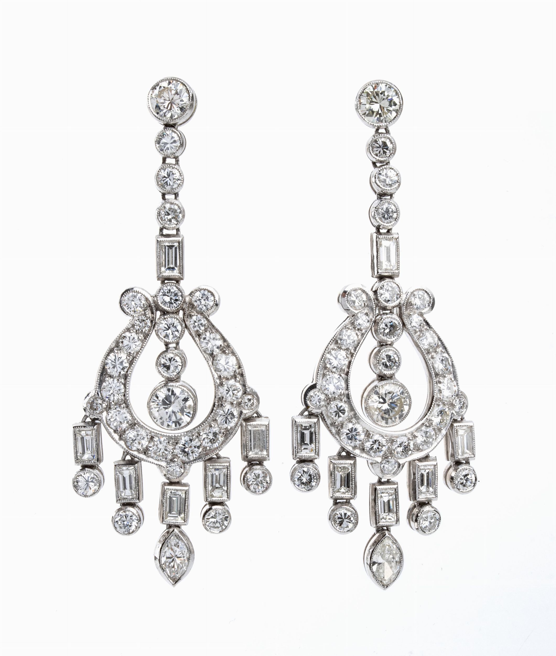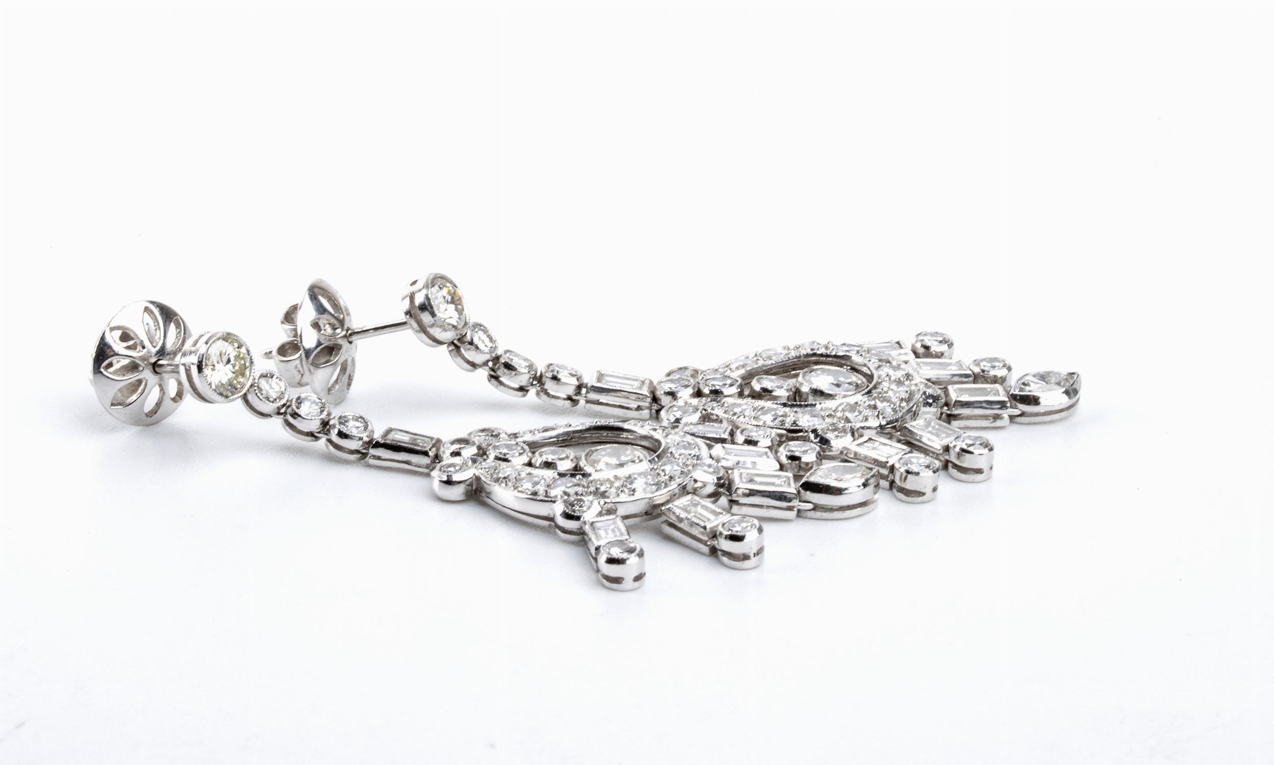N. 62 diamanti di forma rotonda, taglio brillante, n. 12 diamanti di forma rettangolare, taglio a gradini, n. 02 diamanti di forma a navetta, taglio brillante modificato, circa 6.00 ct totali; F-I; VVS-VS.