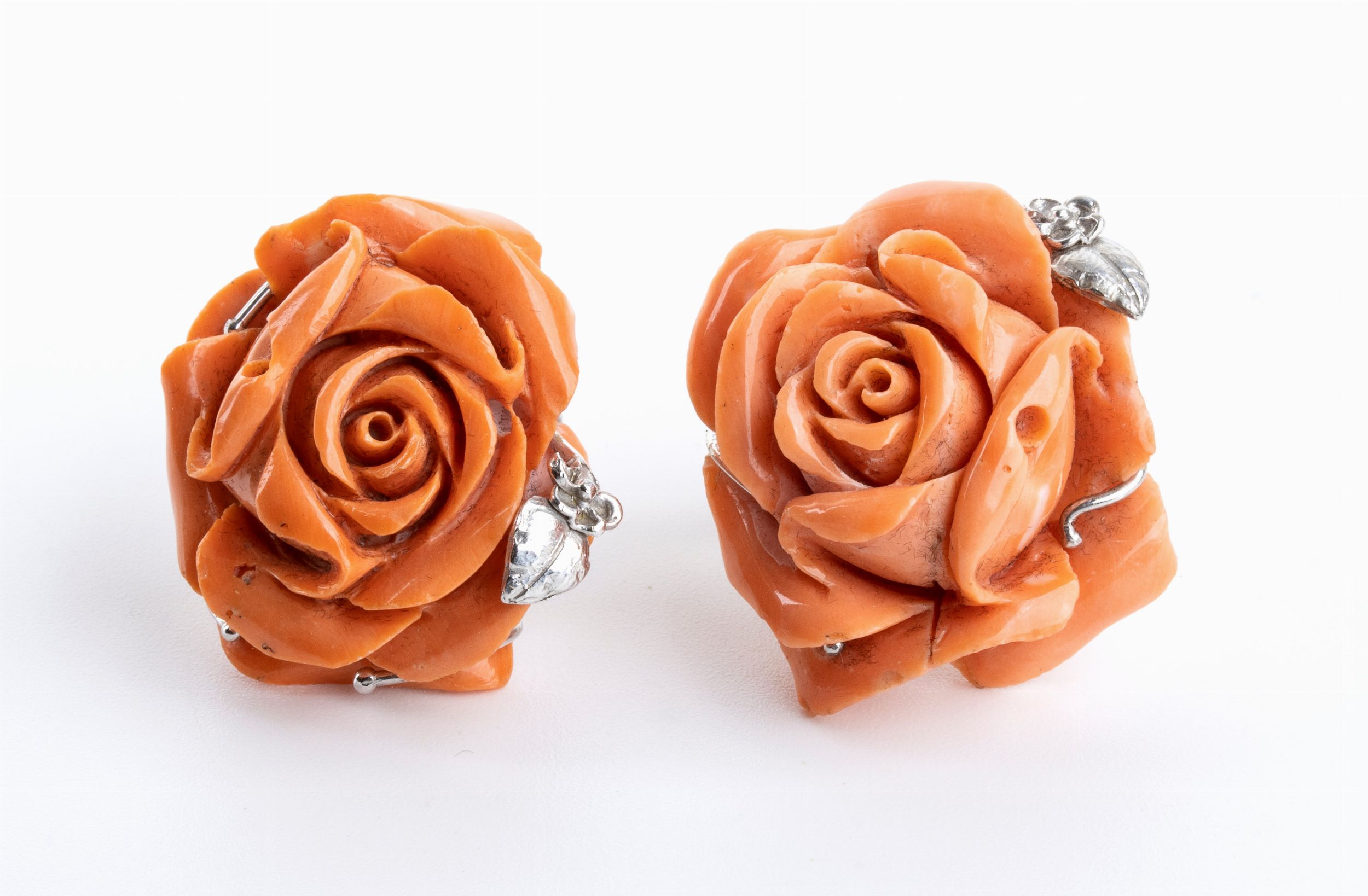 in oro bianco 18k, ciascuno con corallo cersuolo (corallium elatius) scolpito raffigurante un bocciolo di rosa.