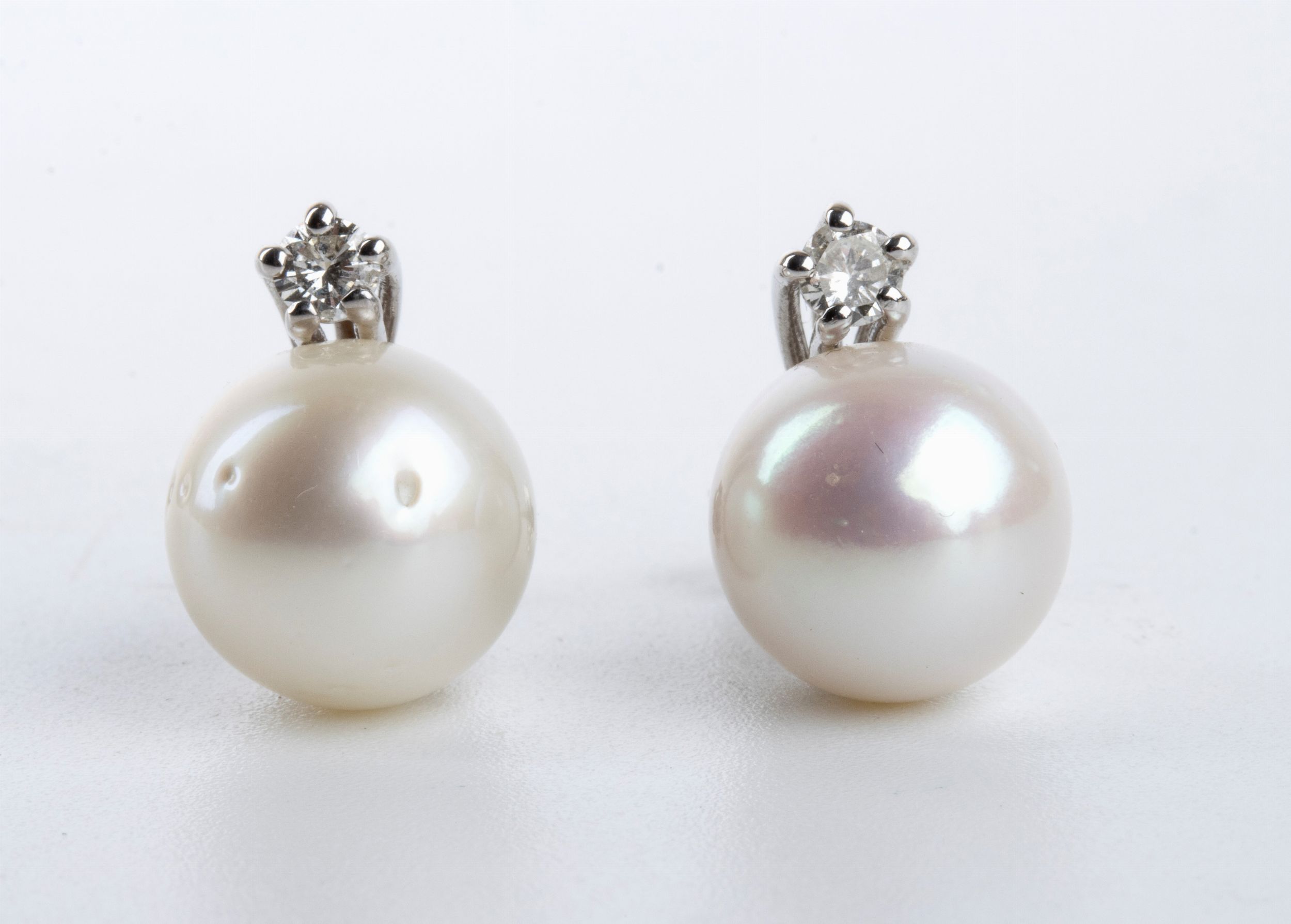 oro bianco 18k, ciascuno con perla Australiana sormontata da diamante.N. 02 diamanti, forma rotonda, taglio brillante, circa 0.30 ct; H-I, SI. Diametro perle 11,5 - 12 mm. Punzonati 750. Peso 9 gr.Stato di conservazione: **** buono.