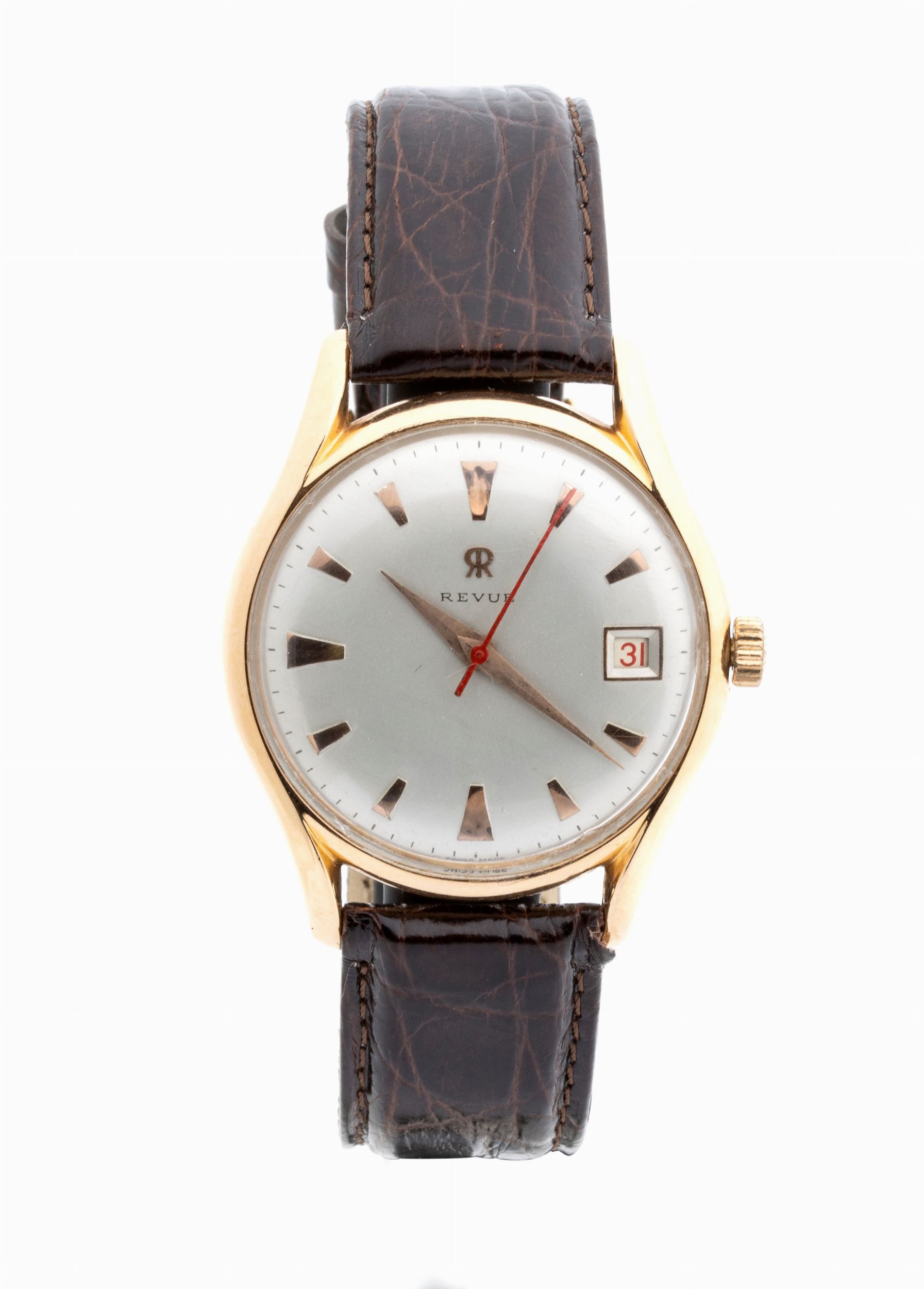 cassa in oro giallo 18K con fondello a vite, quadrante argenté con indici di forma e sfere a gladio e sferea secondi dipinta di rosso, datario alle ore 63. Movimento meccanico a carica automatica Incabloc. Sul fondello seriale nr. 170550. Cinturino e fibbia in metallo dorato commerciale.