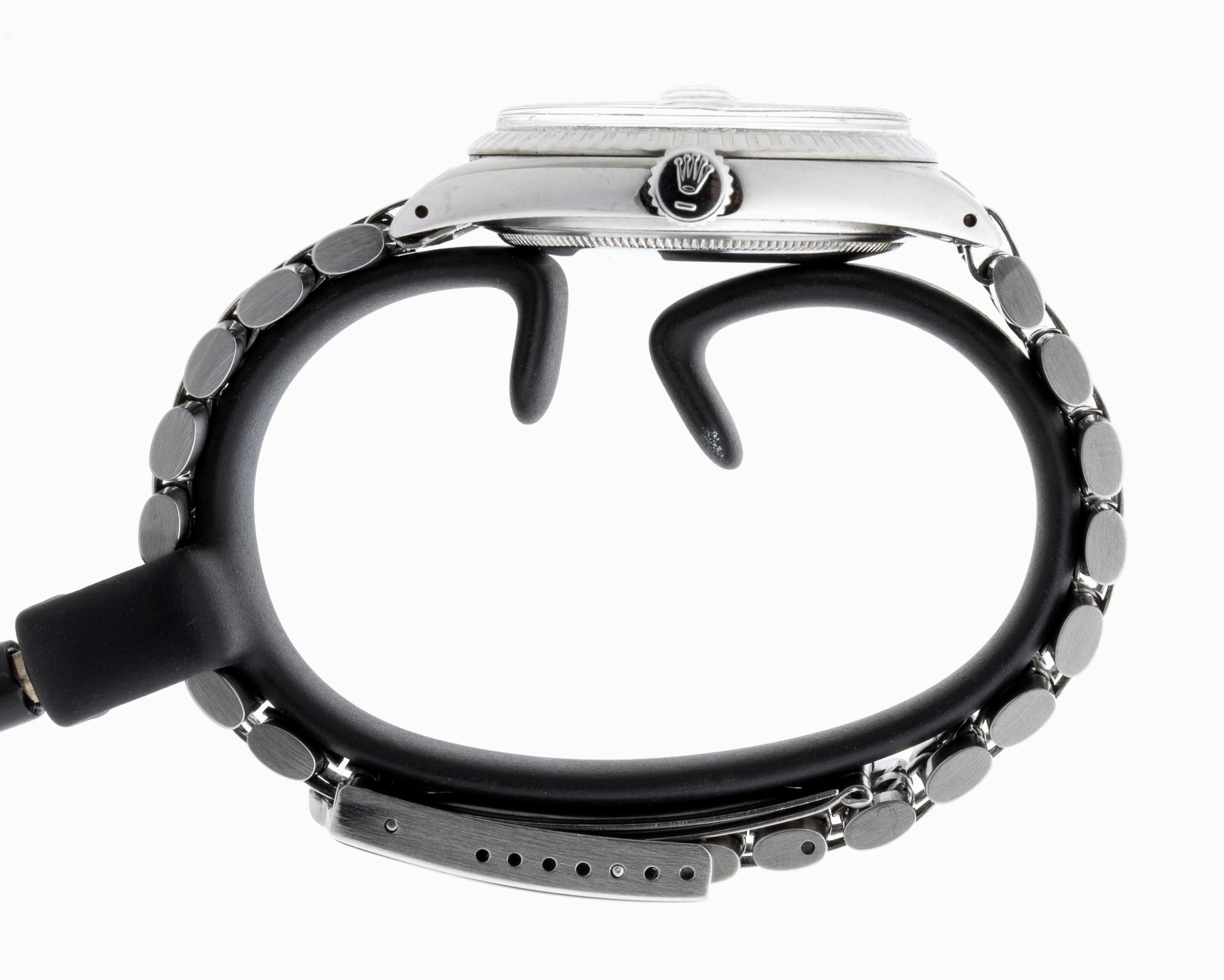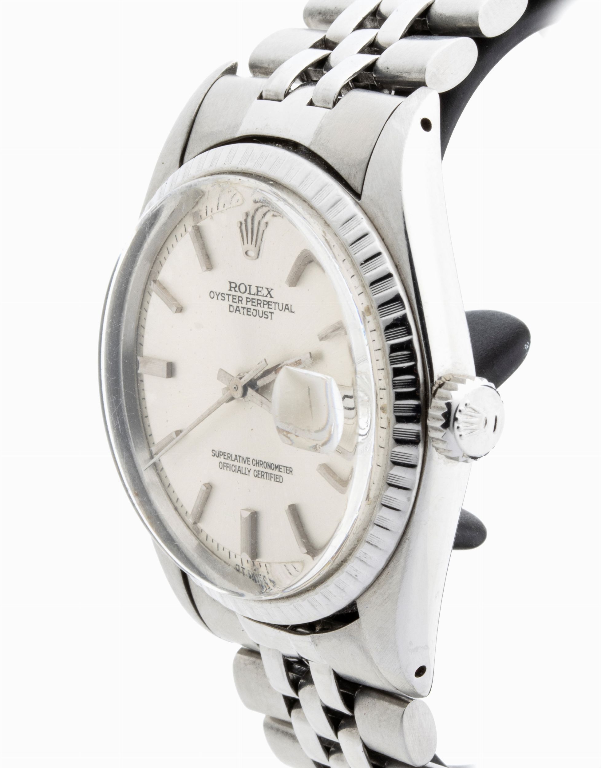 cassa in acciaio con lunetta zigrinata, quadrante argenteč con indici a bastone e sfere dritte argentate, datario alle ore 3 e vetro plastica, movimento meccanico a carica automatica calibro 1570 matricola 3.876.088 risalente al 1974. Cinturino Rolex Jubilee produzione USA. Diametro 36 mm. Peso complessivo 84,10 gr. Stato di conservazione: **** buono, attualmente marciante.