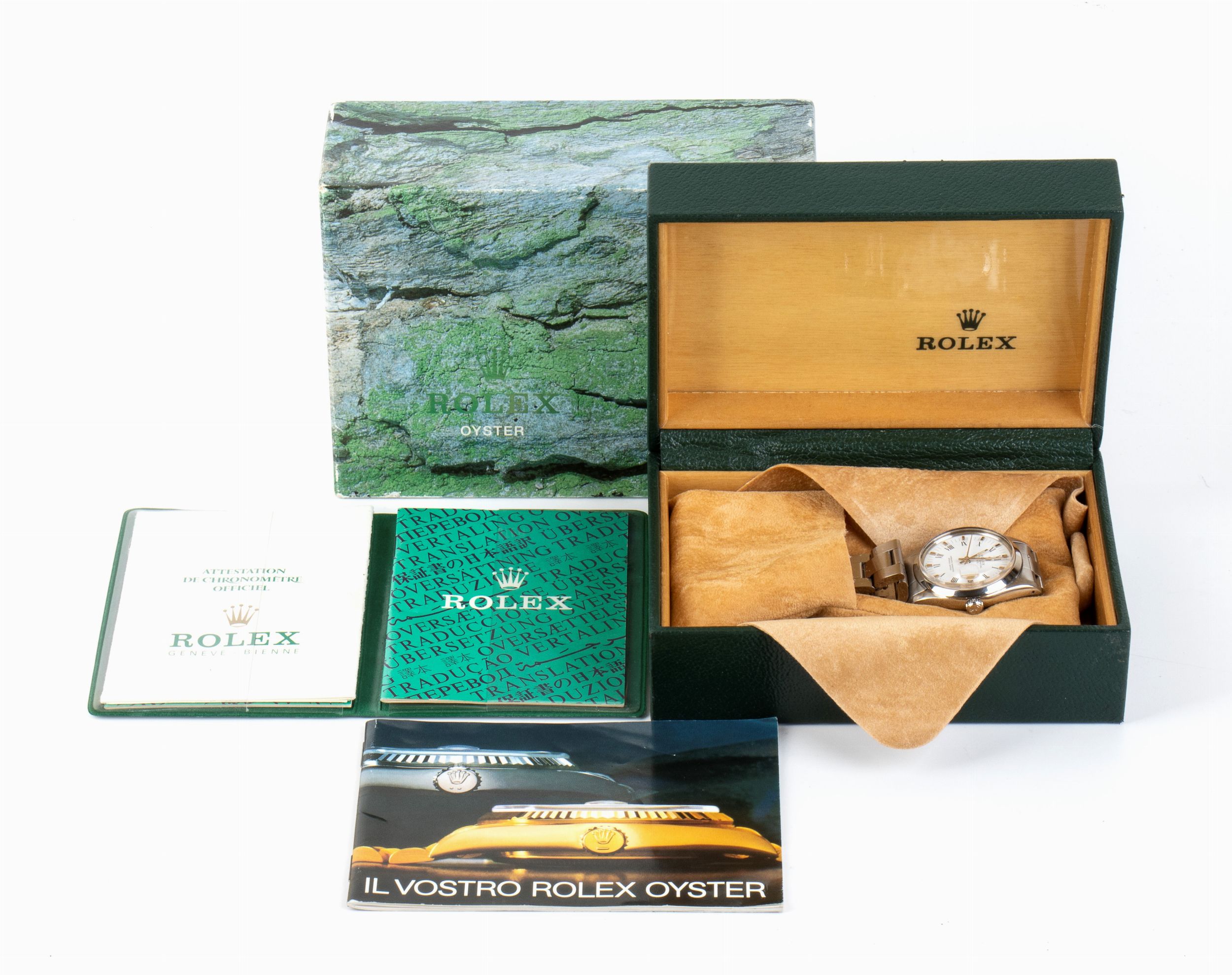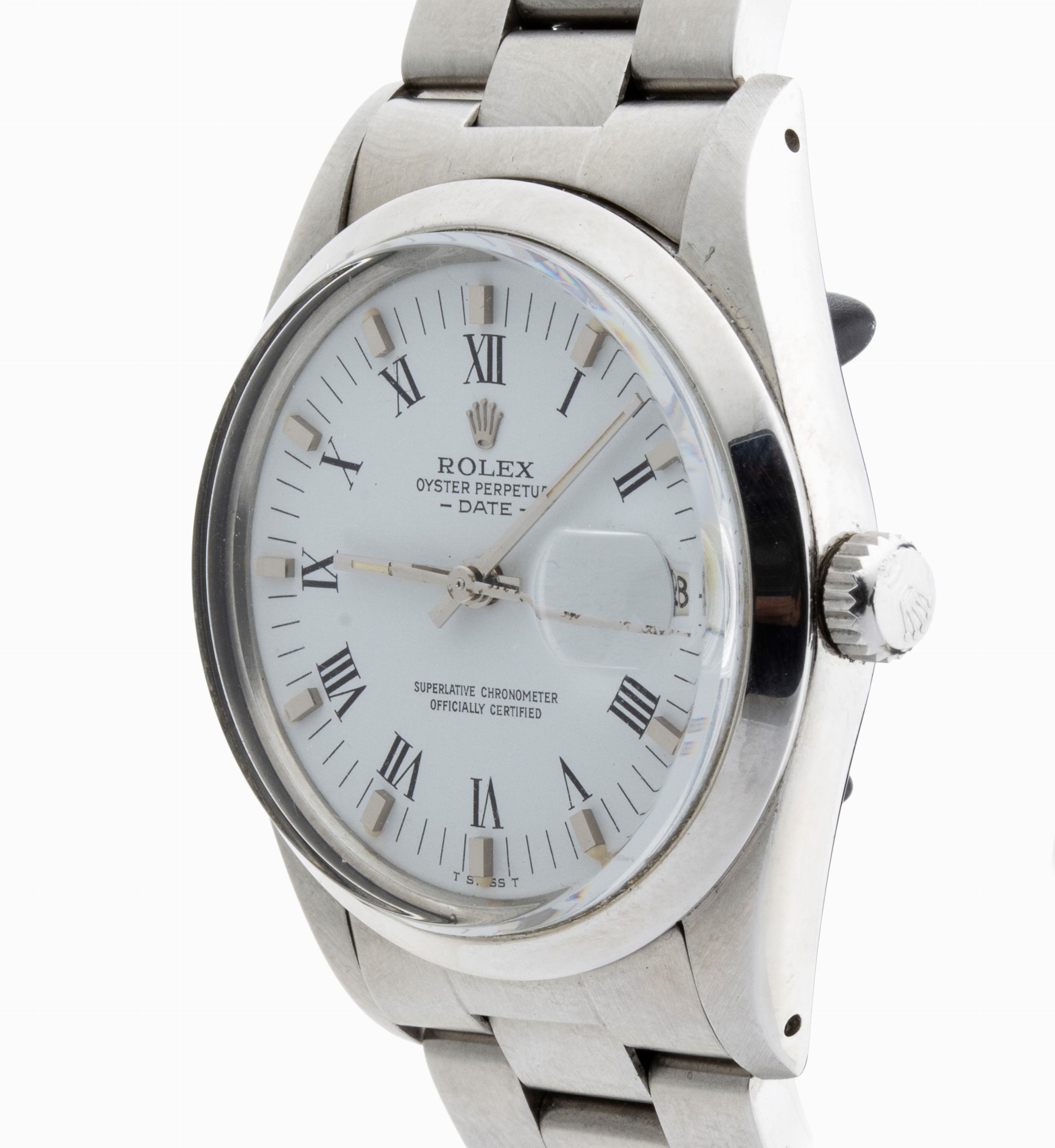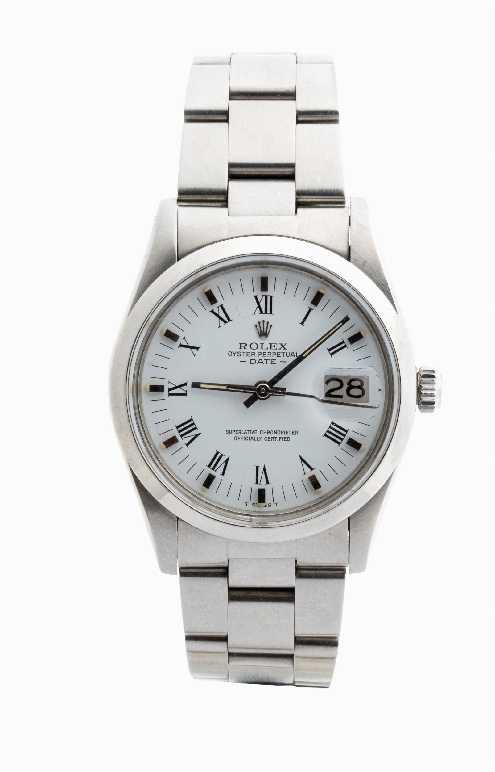 cassa e bracciale Oyster 78350 in acciaio, quadrante bianco con numeri romani e indici e sfere argentati, datario alle ore 3 e vetro plastica, movimento meccanico a carica automatica calibro 1570 matricola 6.745.574 risalente al 1981.