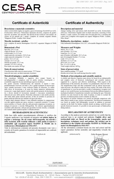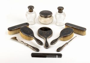 in argento 925/1000 e tartaruga finemente decorata in argento, composto da quattro spazzole, un pettine, uno specchio, due flaconi ed una scatola in vetro molato, un calzare ed un utensile per i guanti. Serie completa di marchi Birmingham 1916-1917, argentieri Mappin & Webb Ltd.