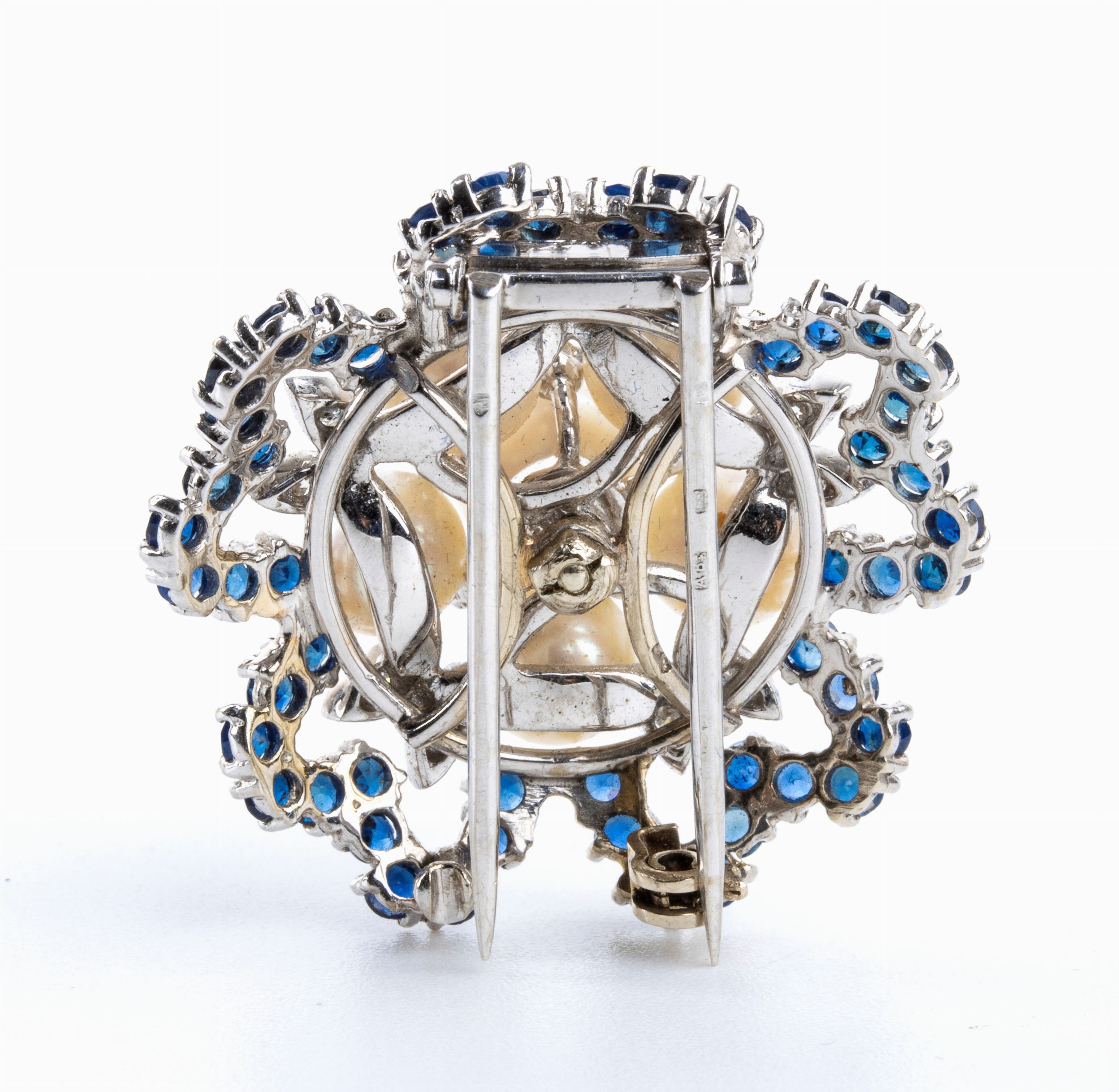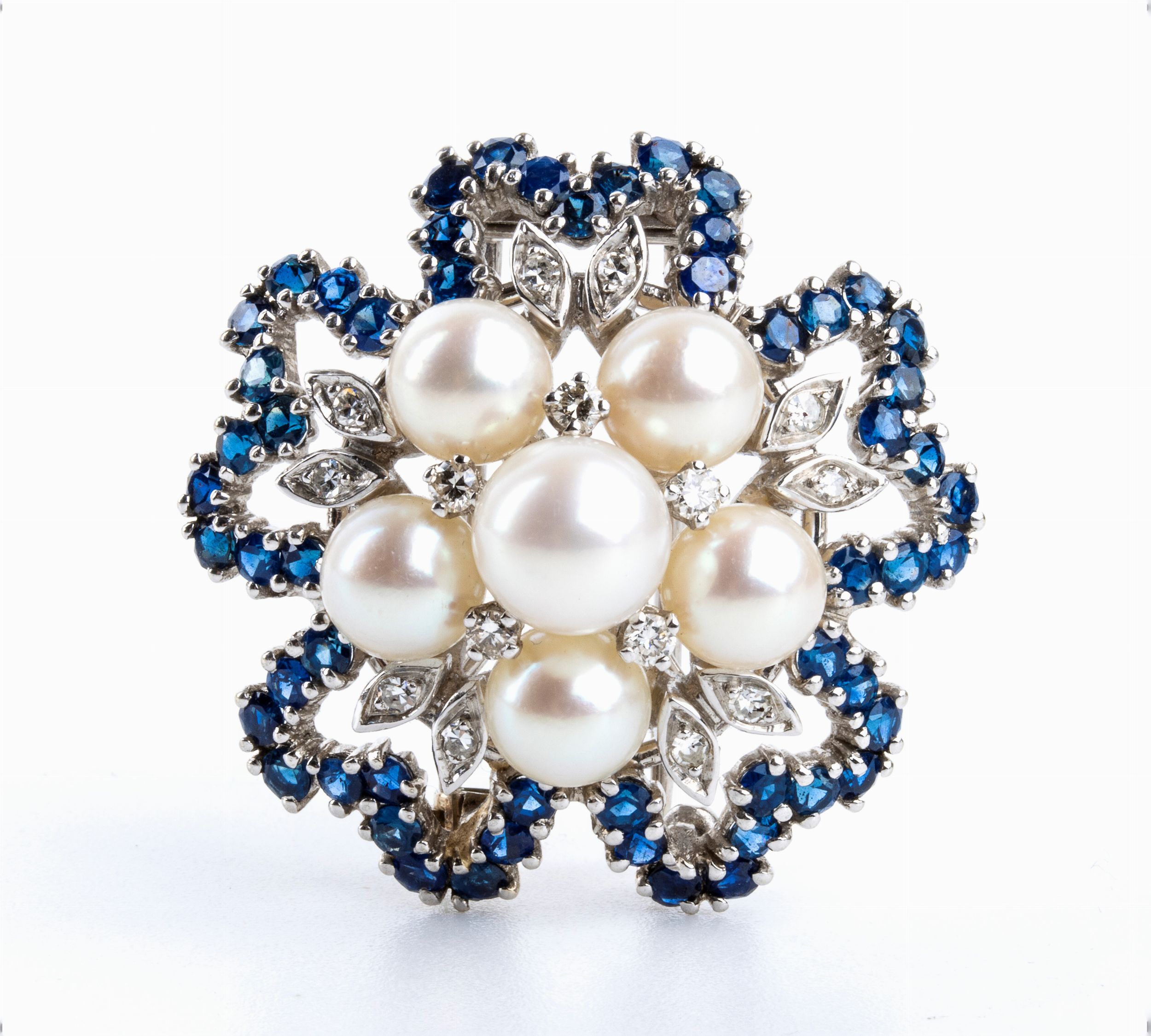 in oro bianco 18k, motivo a fiore con perle coltivate d'acqua salata, diamanti e petali in zaffiri.