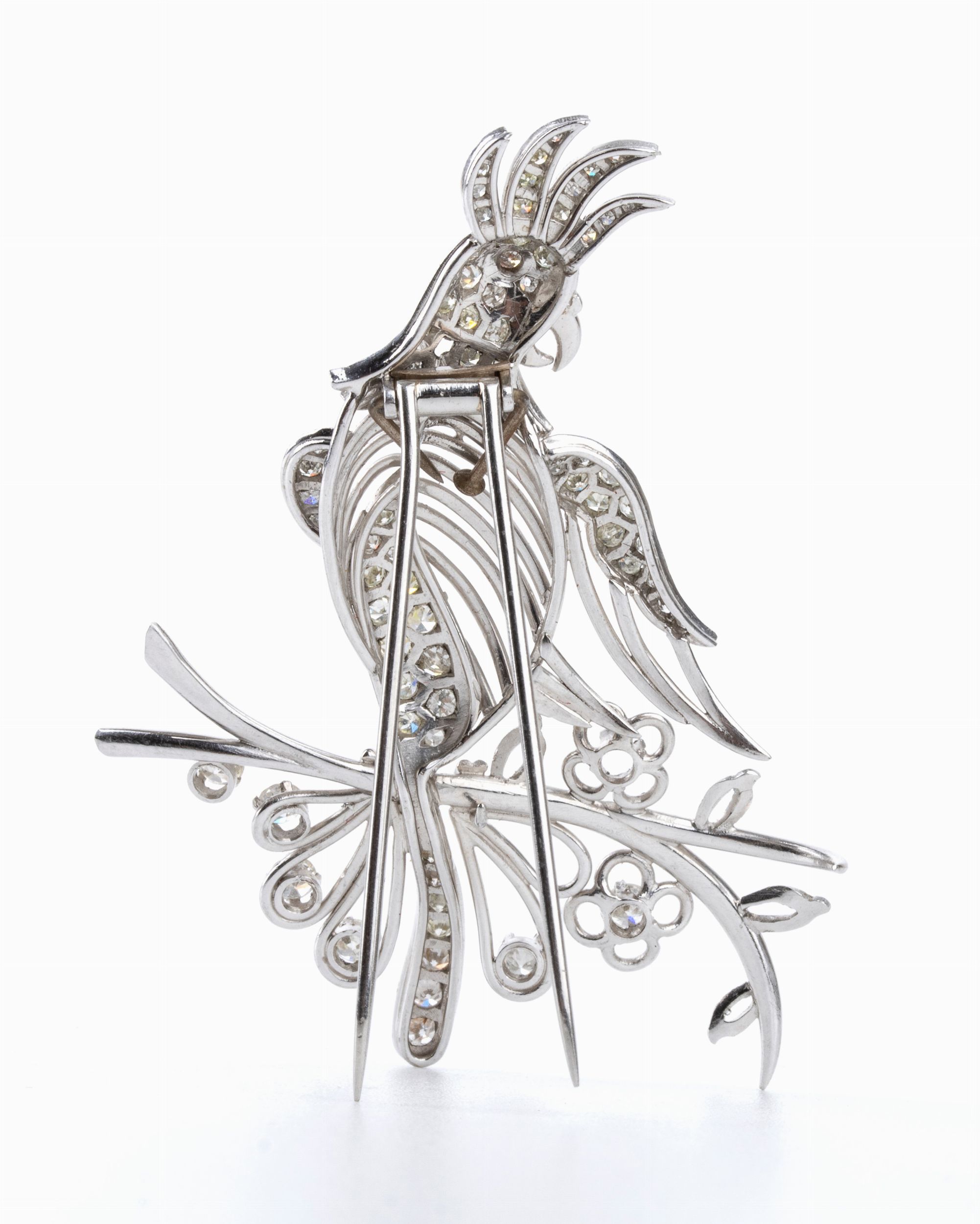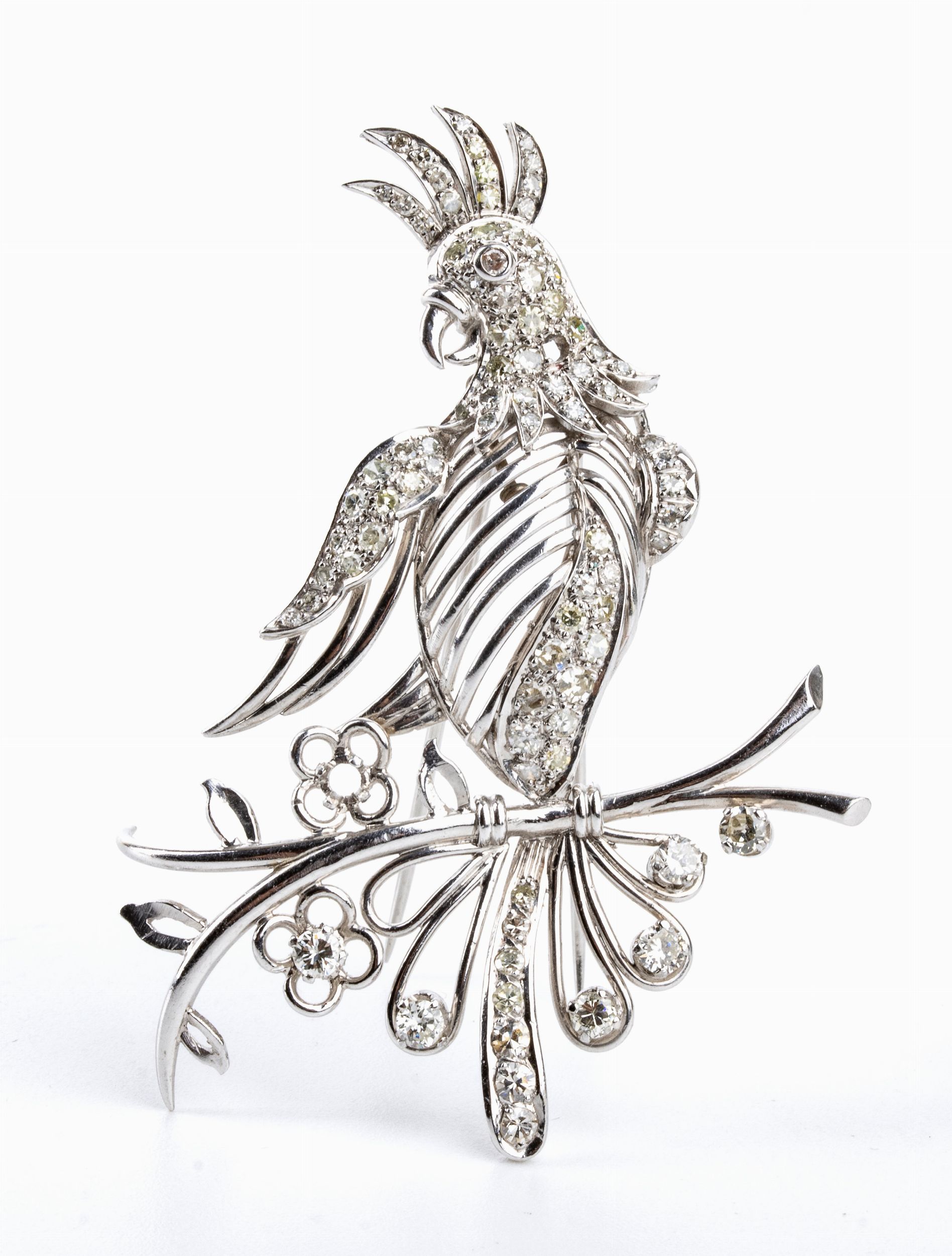 decorata con diamanti rotondi taglio brillante e taglio huit-huit, circa 2.30 ct; G-J; VS-SI.Dimensioni 6 x 4,5 cm. Peso 15,7 gr.Stato di conservazione: **** buono (alcuni diamanti mancanti)