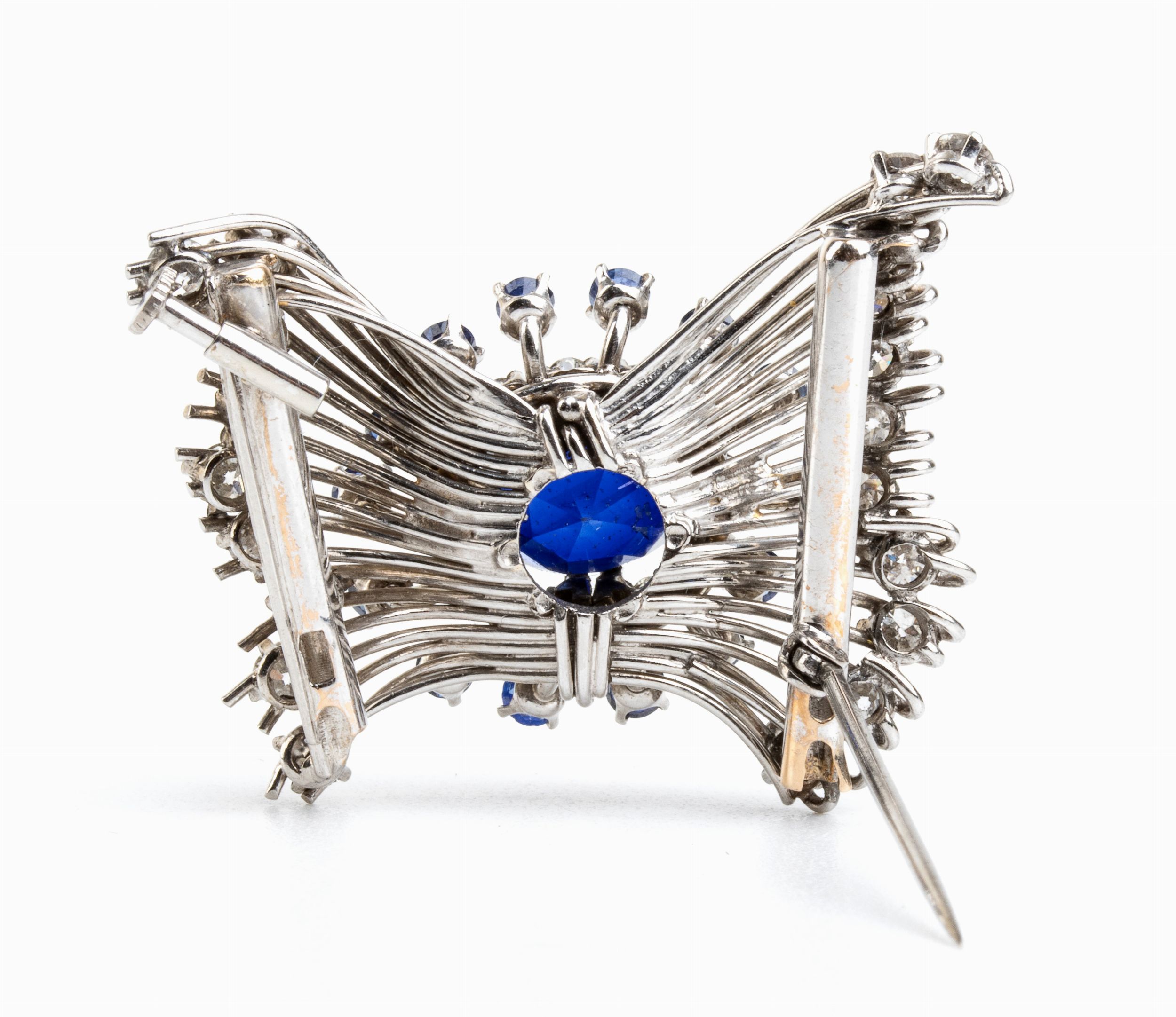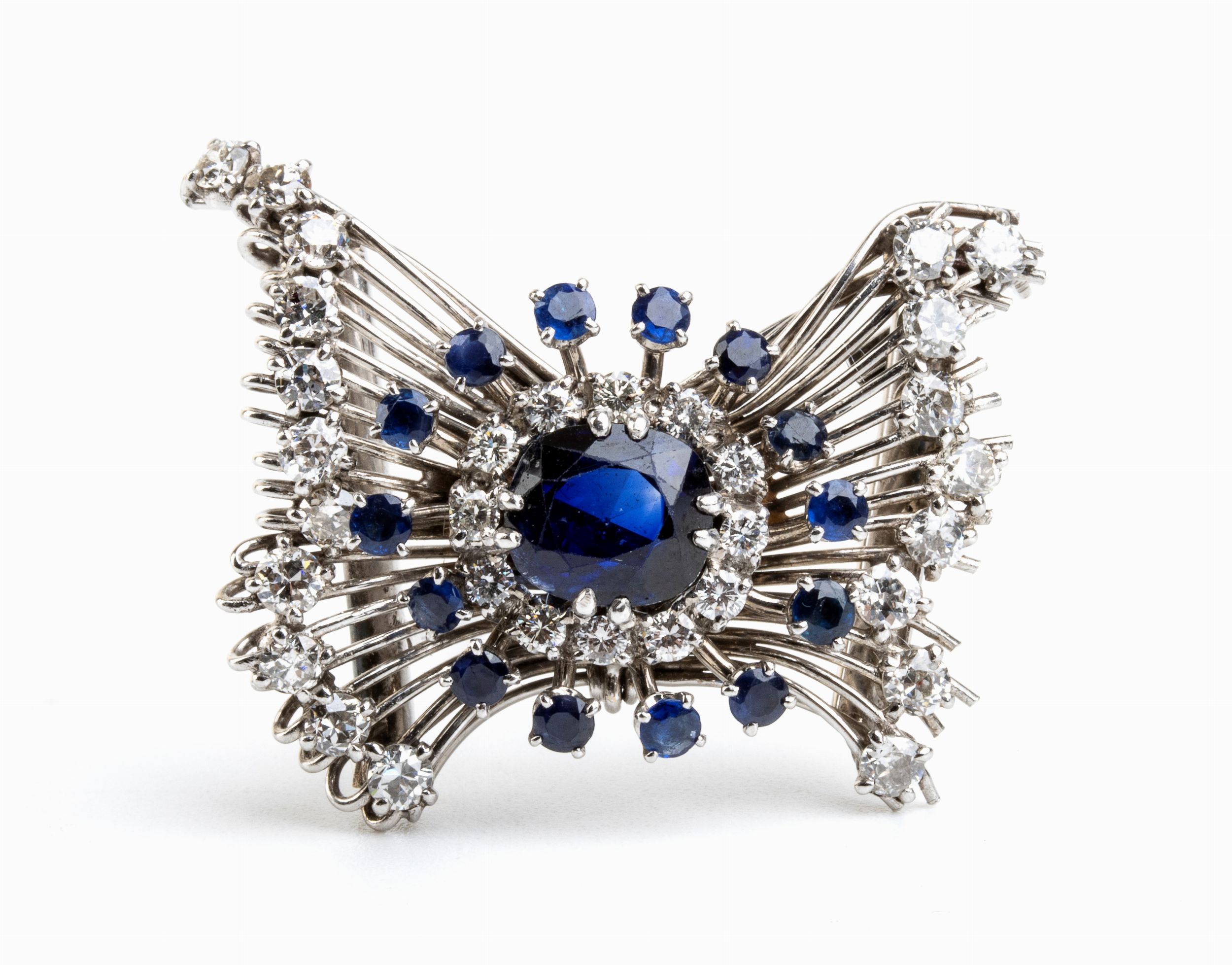 Incastonato con zaffiro centrale contornato da diamanti e da altri zaffiri.