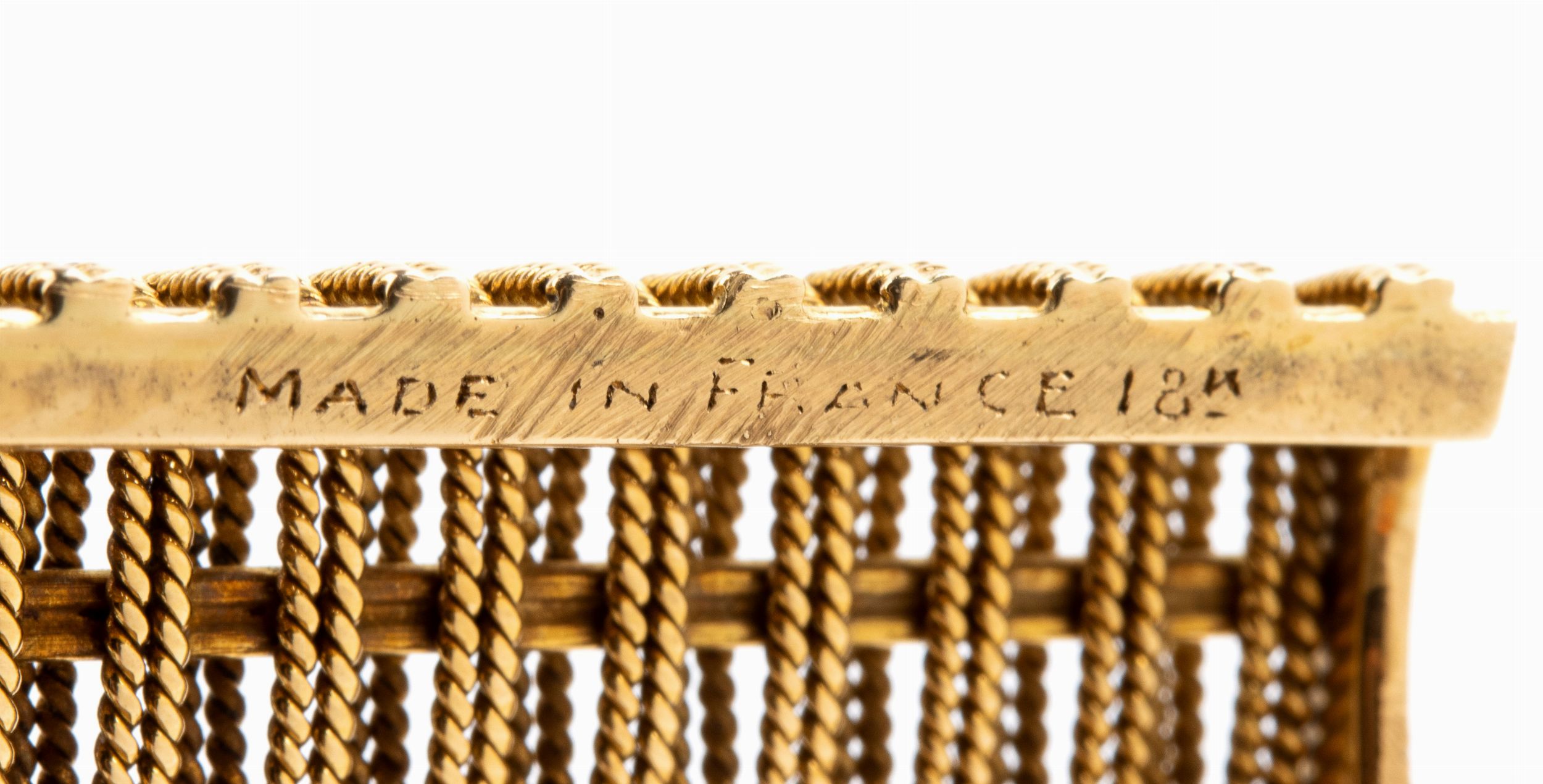 in oro giallo 18k, di forma rettangolare con coperchio incernierato e decorato finemente a maglia intrecciata.Punzonata TIFFANY SCHLUMBERGER - MADE IN FRANCE 18K - 3256, marchio di esportazione francese testa di mercurio ed argentiere P B.