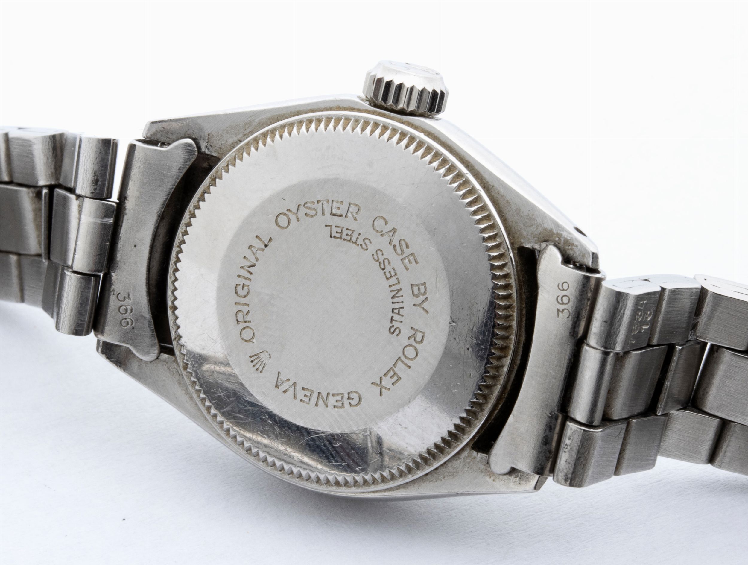 cassa e bracciale in acciaio case by Rolex, quadrante bianco con numeri romani neri e sfere dritte nere, datario alle ore 3 e vetro plastica, movimento meccanico a carica automatica. Diametro 25 mm. Peso complessivo 40,70 gr. Stato di conservazione: **** buono, attualmente marciante.