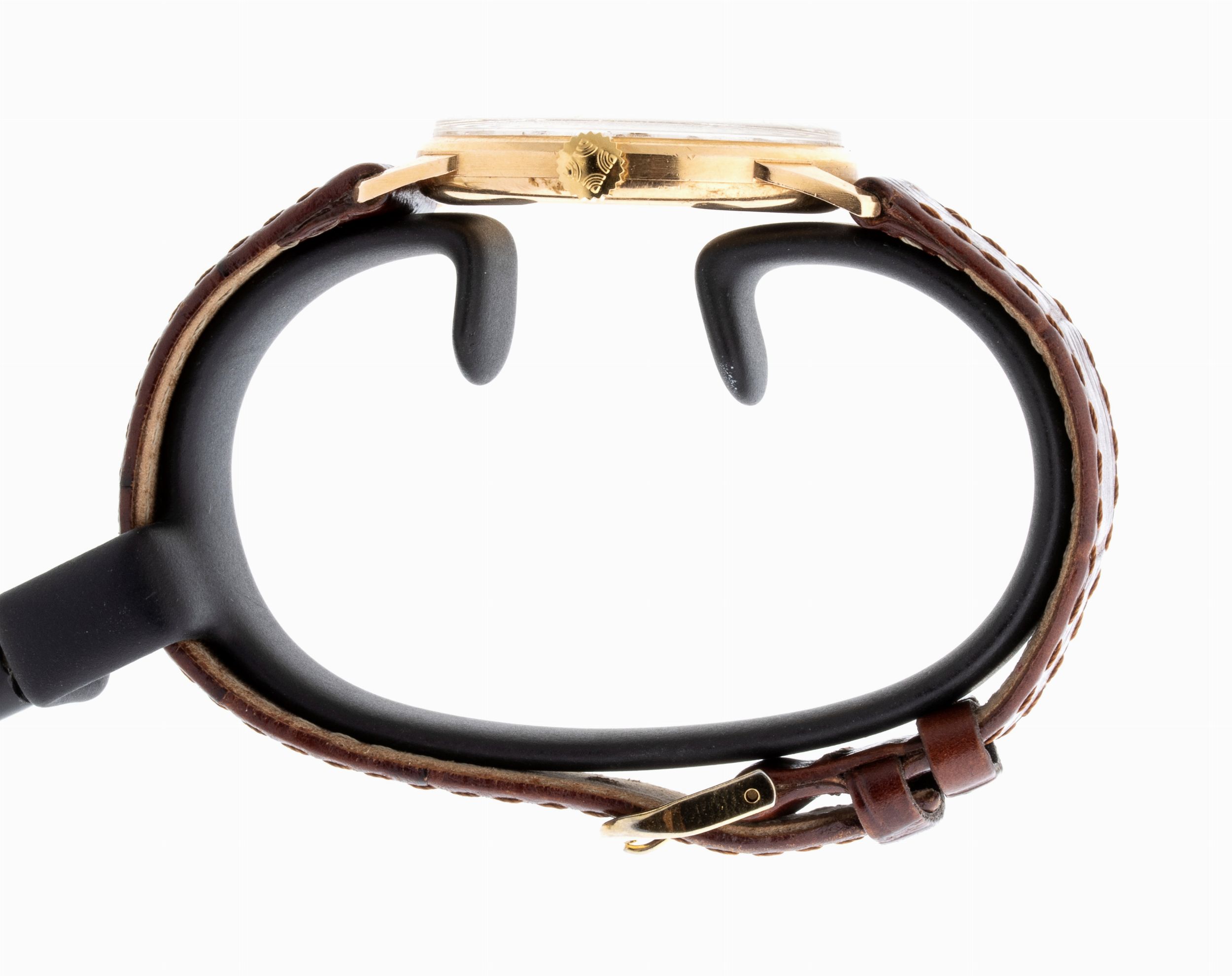 cassa con fondello a scatto in oro giallo 18K, quadrante bianco con indici arabi e dritti e sfere a lancia, secondi alle ore 6. Movimento meccanico a caríca manuale. Numero di matricola 884238. Numero matricola movimento 5194528. Cinturino in pelle con fibbia in metallo dorato.