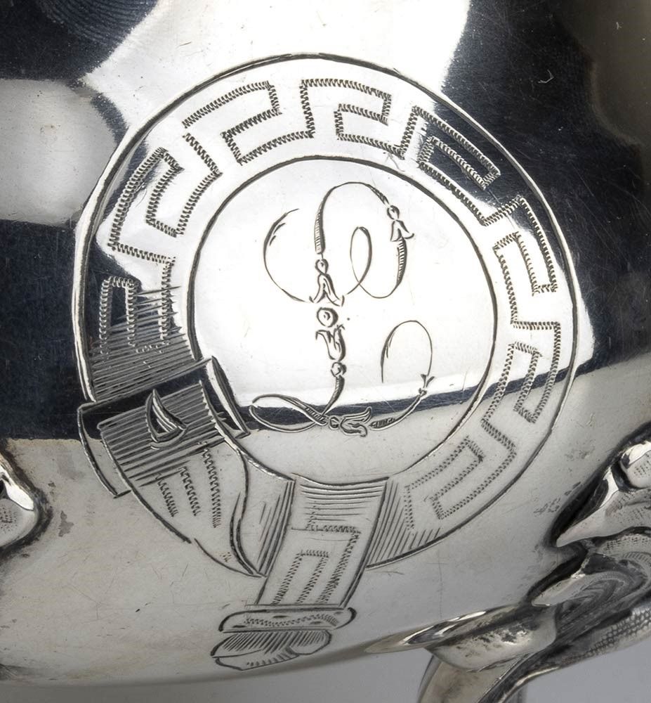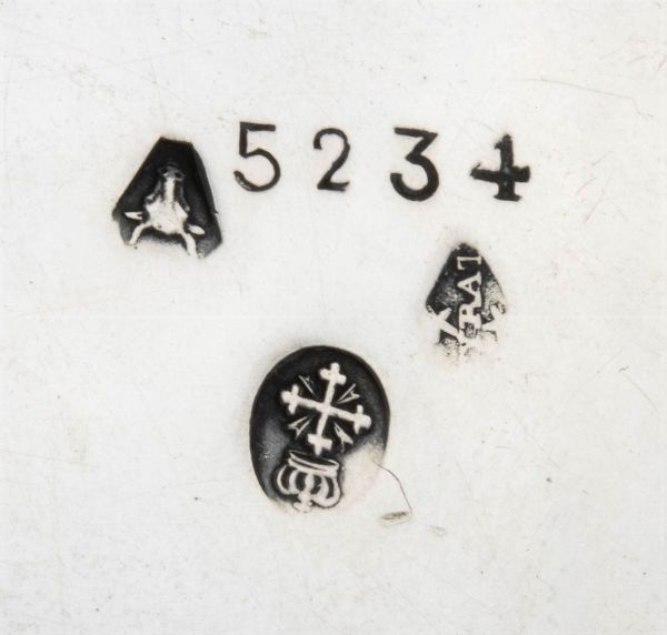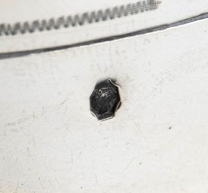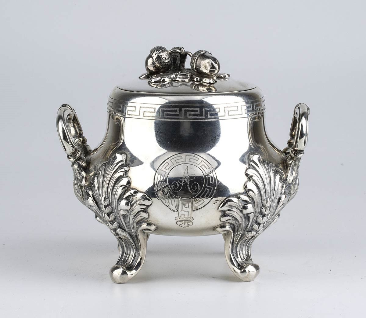 di forma circolare con manici laterali poggiante su quattro piedini fogliati; coperchio con bordino ad innesto cimato da un fastigio con ghiande e foglie di quercia. Argento 800/1000, punzonata con il marchio di esportazione francese testa di mercurio in uso a partire dal 1840, argentiere Jean Francois Veyrat, 1831-1840 e con i marchi in uso a Torino, Regno di Sardegna dal 1824 al 1872.