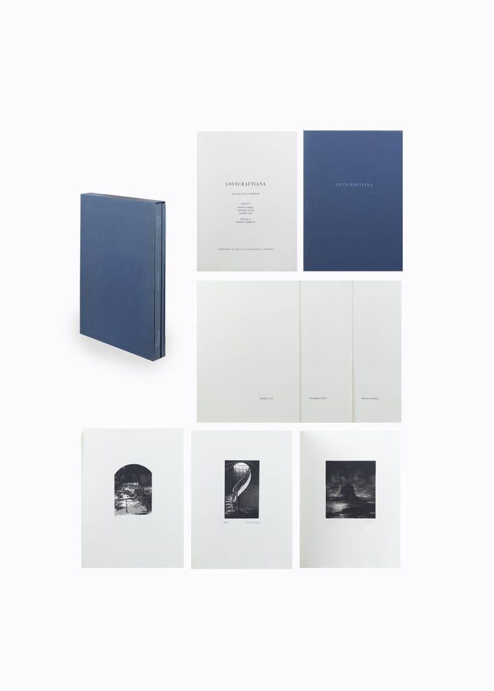 A-32 5x24 foglio 13 5x11 5 acquaforte e acquatinta es. XXXV/C B-32 5x24 foglio 14x8 5 acquaforte es. XXXV/C C-32 5x24 foglio 13x9 acquaforte es. XXXV/C A-Opera firmata in basso a destra e numerata in basso a sinistra (a matita sul foglio) B-Opera firmata in basso a destra e numerata in basso a sinistra (a matita sul foglio) C-Opera firmata in basso a destra e numerata in basso a sinistra ( a matita sul foglio) Volume intitolato Lovecraftiana tre racconti di H. P. LOVECRAFT contenente le stesse tre incisioni di Franco Fanelli Vincenzo Gatti e Daniele Gay. Prefazione di Oddone Camerana. Edizioni d'arte tuttagrafica Torino.