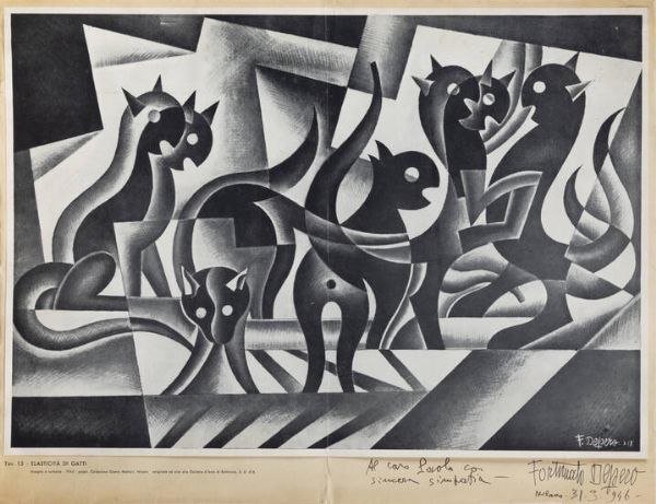 31x44 stampa litografica in bianco e nero Firma in lastra in basso a destra e firma autografa con data e dedica sulla busta Stampa applicata su busta contenitore autografata e dedicata (sulla busta) dal pittore Al caro Paolo con sincera simpatia Milano 31/3/1946 Al retro reca la scritta a stampa: Prima raccolta di 22 disegni del pittore-poeta Fortunato Depero. Riproduzione di 200 copie numerate e singolarmente firmate dall'artista