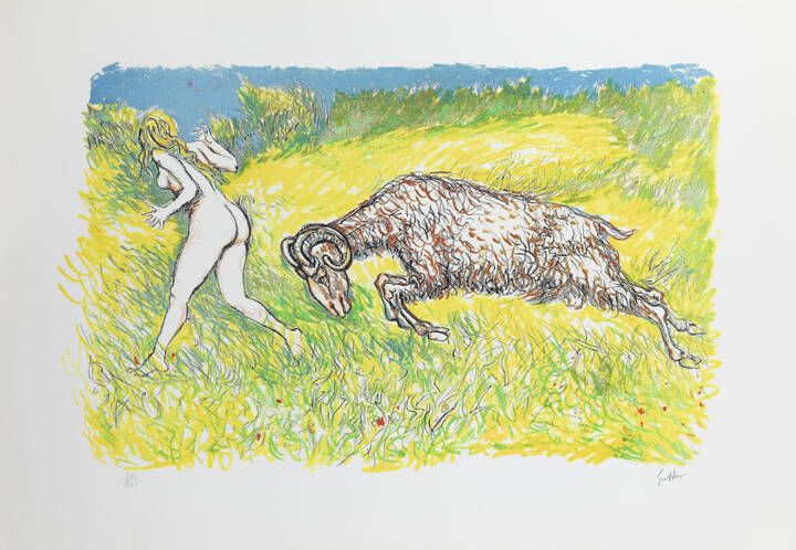 RENATO GUTTUSO Bagheria (PA) 1911 - 1987 Roma : Nuda che fugge da un caprone  - Asta Grafica - Associazione Nazionale - Case d'Asta italiane