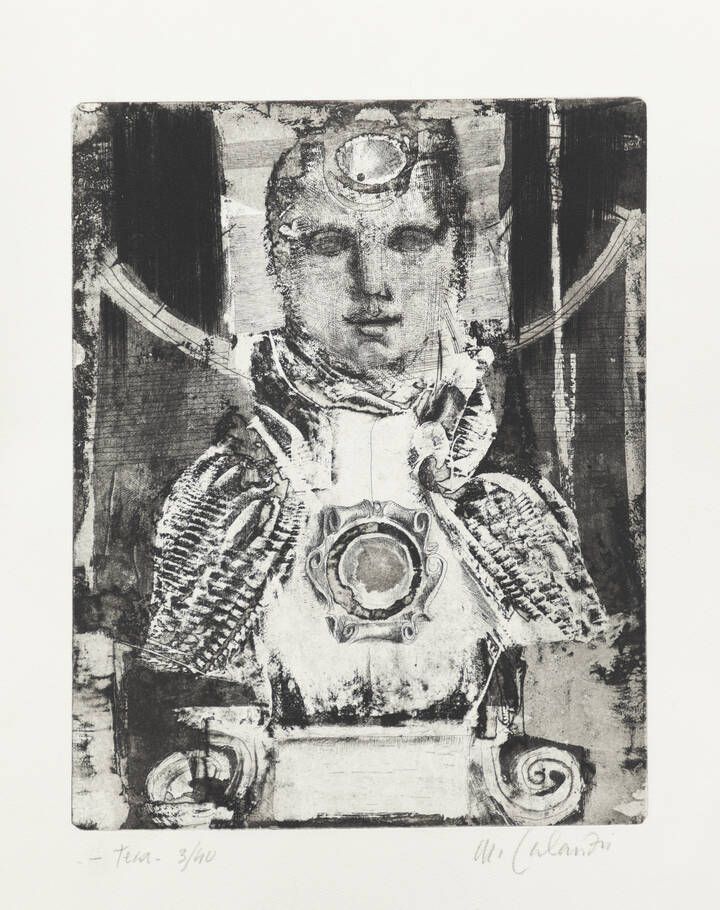 42x34 foglio 33 5x26 4 acquaforte e acquatinta es. 3/40 Opera firmata in basso a destra intitolata e numerata in basso a sinistra (a matita sul foglio) Tiratura: 40 esemplari firmati e contrassegnati con numeri arabi e alcune prove Esp.:1991 Pescara; 1992 Grottammare (AP) 1992 Oderzo (TV) Bibl.:- Bellini 1991; - Trentin 1992 - Maurizio Fagiolo dell'Arco Franco Fanelli e Vincenzo Gatti Catalogo generale delle opere di Calandri - Le incisioni - 1937/1991 Allemandi Torino 1996 n. 166 pagina non numerata
