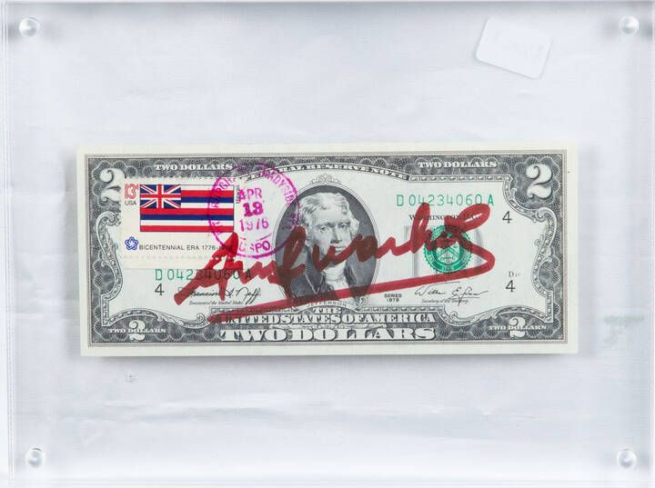 6 5x15 5 banconota 15x20 teca n. D04234060A anno1976 Firma a pennarello sul fronte e timbro al retro; contenuta in teca di plexiglass Certificato d'autenticità della Galleria 32 Nizza rilasciato il 18/10/2019